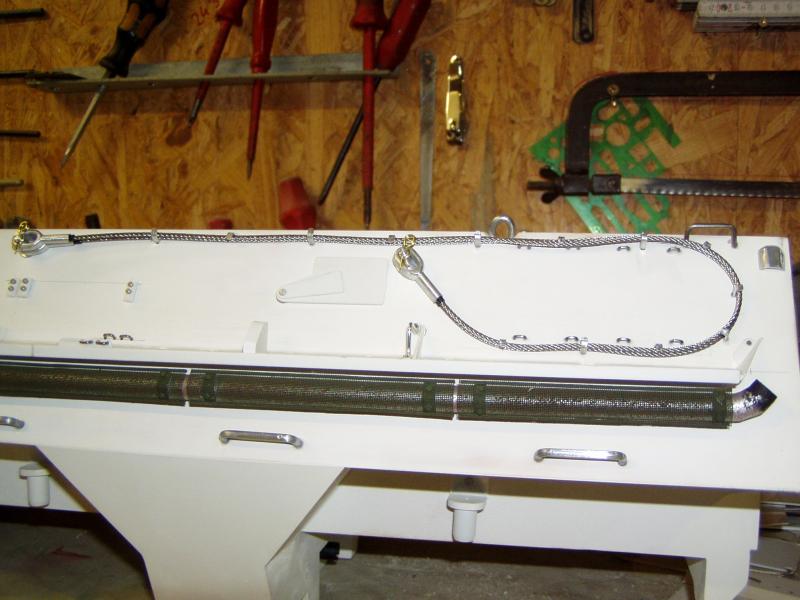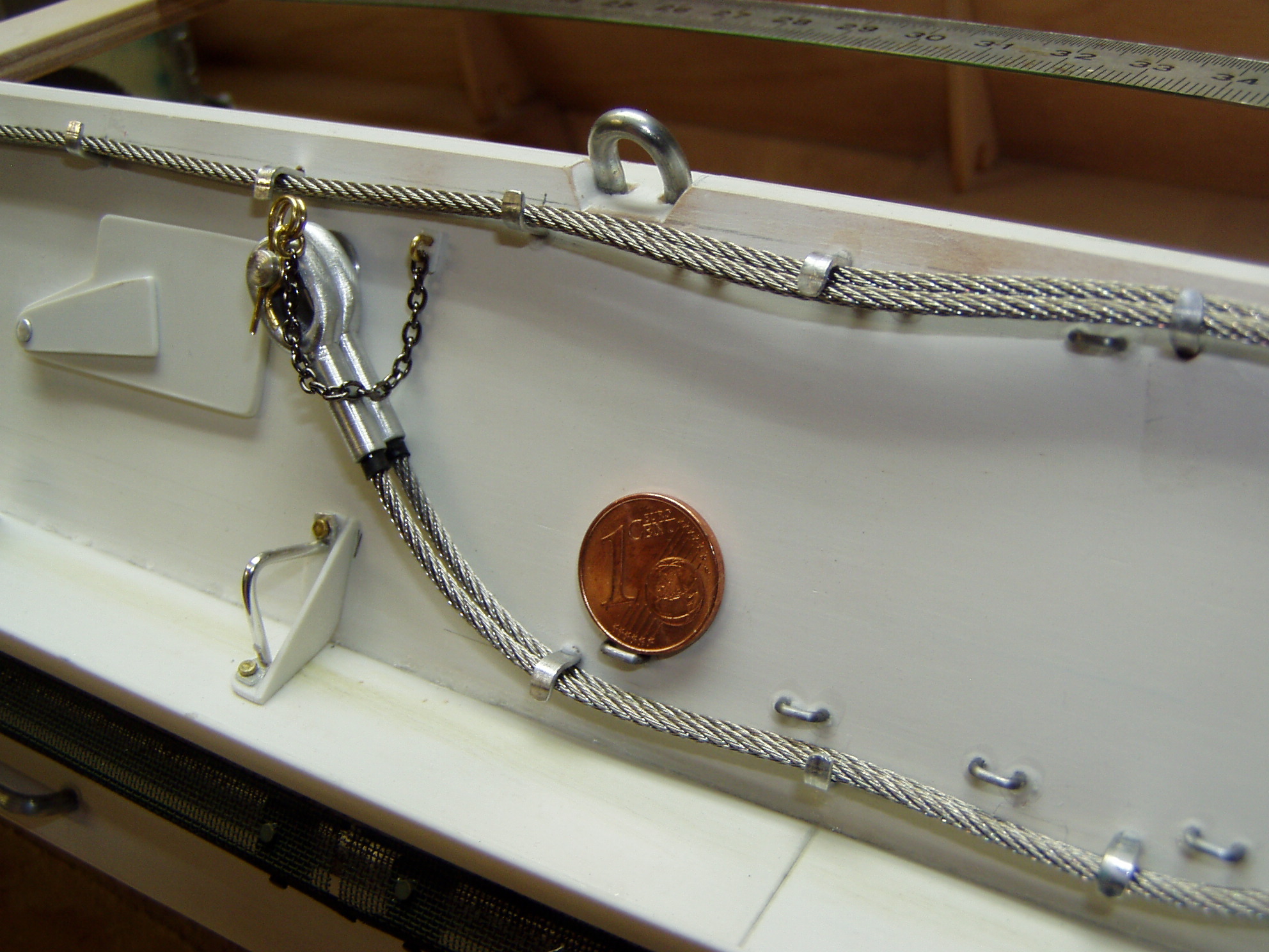 2 Bergeseile gebastelt. Seil ist 2 mm V2A, je 48 cm lang, muß noch gealtert werden. Die "Enden" habe immer noch keinen besseren Ausdruck dafür) fertig befeilt/beschliffen und angeklebt. Die Sicherungssplinte aus 0,8 mm Messingdraht gebogen.