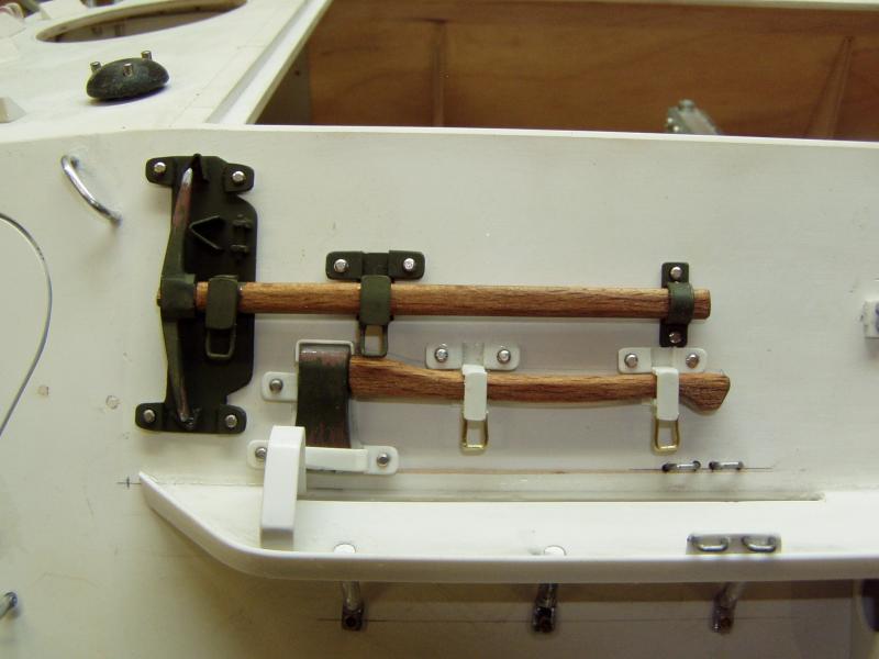 Lob spornt an, vielen Dank an euch. Spitzhacke und Axt haben ihren Platz an der Wanne gefunden. Beil kommt noch. Die silbernen Stellen sind kleine 2 mm Bolzen, sollen leicht erhaben die Schrauben darstellen. Leider habe ich keine detailierten Fotos gefunden, deshalb etwas improvisiert. Die Schnappverschlüsse(nehme ich an?) sind aus 0,8 mm Messingdraht nachgebildet und mit den Werkzeugstielen fest verklebt, müssen an der Axt noch angestrichen werden. Somit kann ich die Werkzeuge bei der Lackierung der Wanne noch abnehmen. Wenn sie endgültig befestigt sind, werden sie dem Tarnmuster angeglichen. Die Halterung der Axt hinter der Tarnstangenhalterung ist etwas zu weit nach rechts geraten, mangels Fotos. An der Halterung der Spitzhacke ist ein kleiner, nach links gewandter Teil und rechts daneben ein Splint, keine Ahnung, was dort befestigt wird am Original.