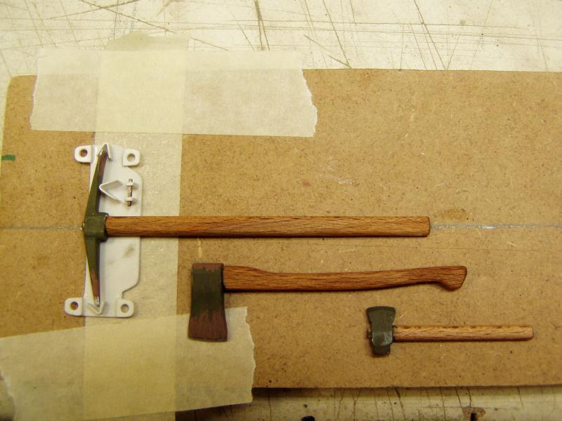 nun bitte ich um eure Geduld, es gehr bedeutend langsamer weiter. Spitzhacke, Axt und Beil an 3 Nachmittagen aus Alu gefeilt und mit Buchenholzstiel versehen, entsprechend gealtert mit "Rost", Stiel mit Firnis behandelt. Die entsprechenden Halterungen werde ich fest mit den Werkzeugen verkleben, später als "Einheit" mit dem Modell. Abnehmbar in 1:10 ist selbst mir zu übertrieben.