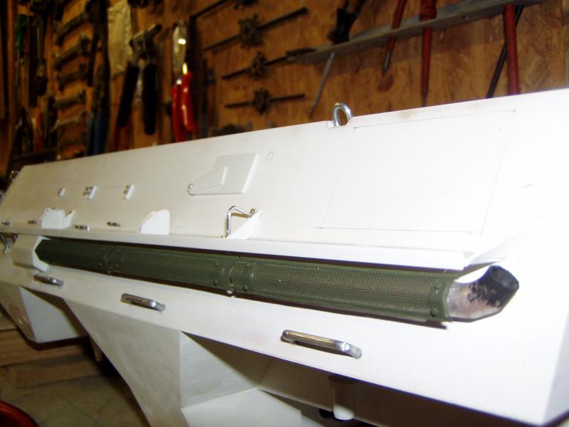 Das Auspuffrohr wurde silbern lackiert. Mittels Zahnbürste spritzte ich verdünnten Revell 83 matt(Rost) auf. Das Ende ist mit schwarz matt mittels Pinsel verrußt, die Hitzeschutzbleche aus Gittermaterial aufgebracht und bronzegrün gespritzt. Wieder 12 Schrauben M1,2. Das Rohrgebilde ist noch abnehmbar, zum Lackieren der darunter liegenden Bereiche.