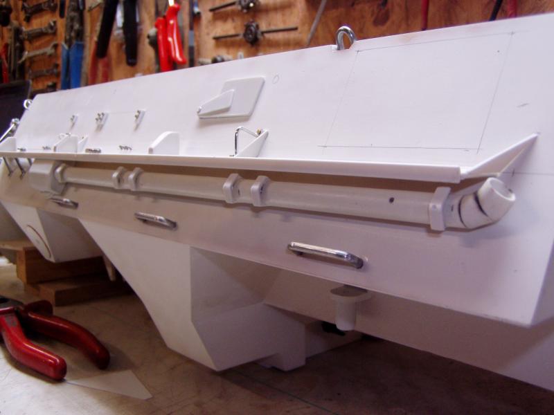 Die kleinen Häkchen, um welche das Bergeseil abwechselnd von oben/unten gewunden wird, sind aus 1,6 mm Aludraht entstanden. Enden plattgedrückt, abgewinkelt und in etwa 2 mm Abstand oben/unten wechselseitig eingeklebt. Am Modell 1:35 waren es 12, auf einem Bild 13, nun, wieder künstlerische Freiheit.