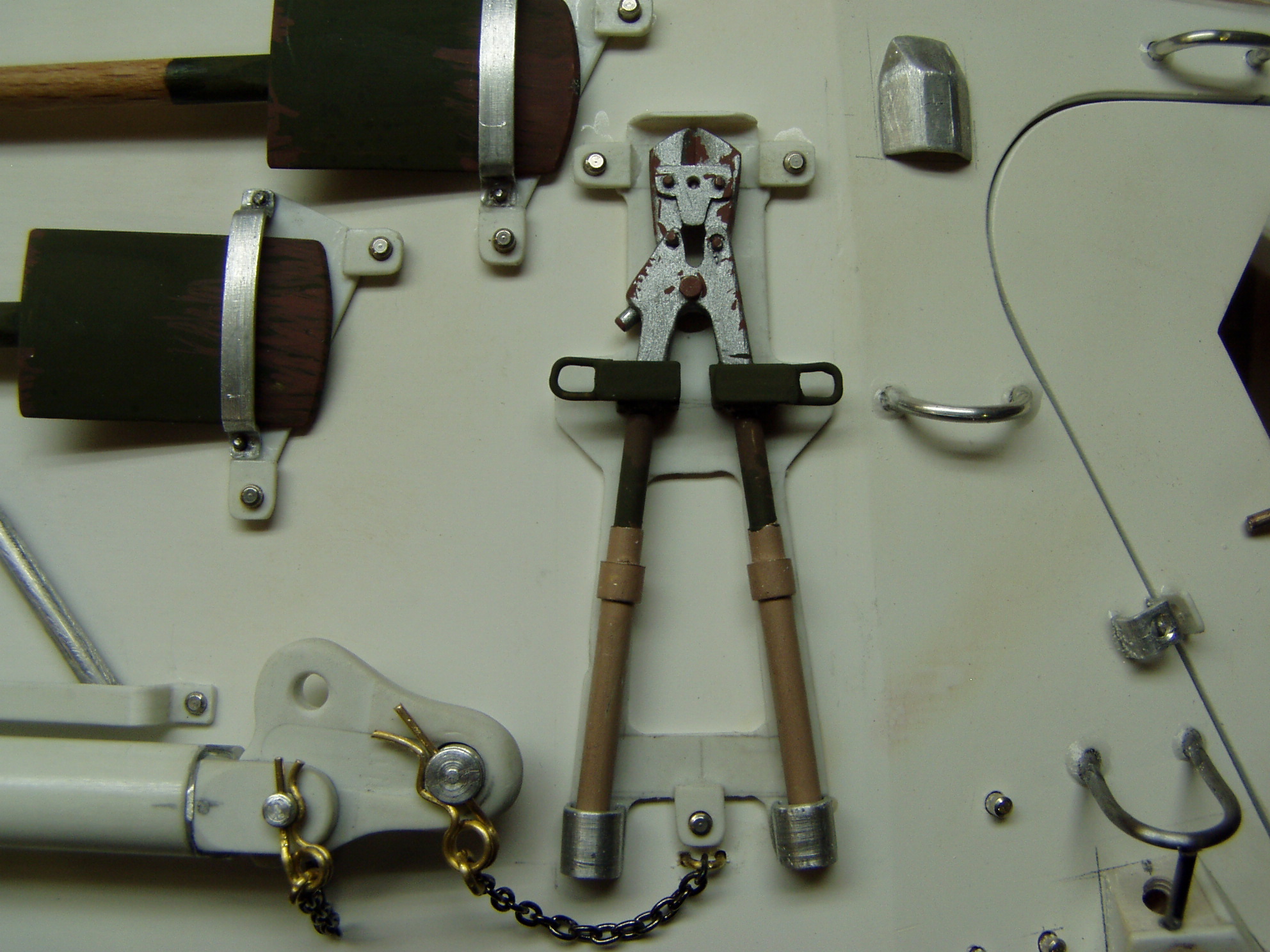 Also Bergegeschirr nach hinten versetzt, Löcher zugespachtelt, Halterungen für Säge, 2 Spaten und Bolzenschneider erstellt. Stiele der Spaten aus Buchenrund gedreht, Spatenblätter aus Alu, bemalt und bissel gealtert.