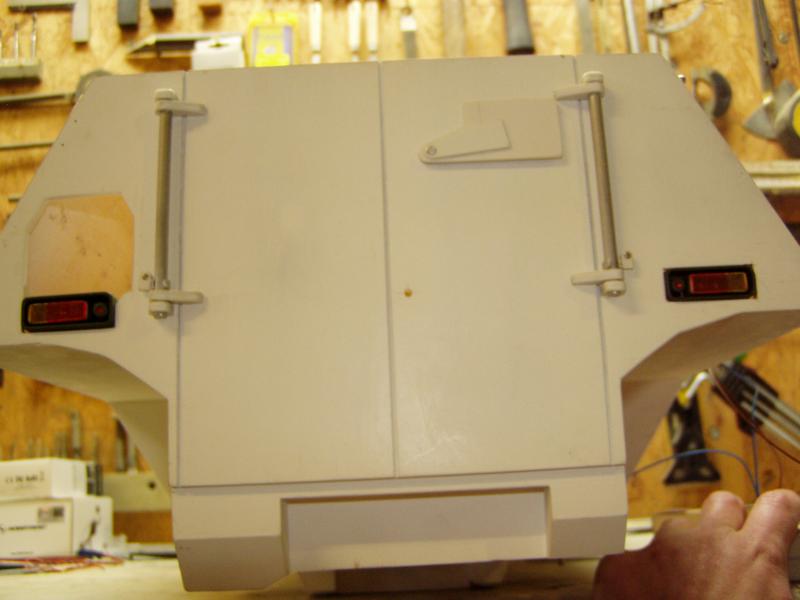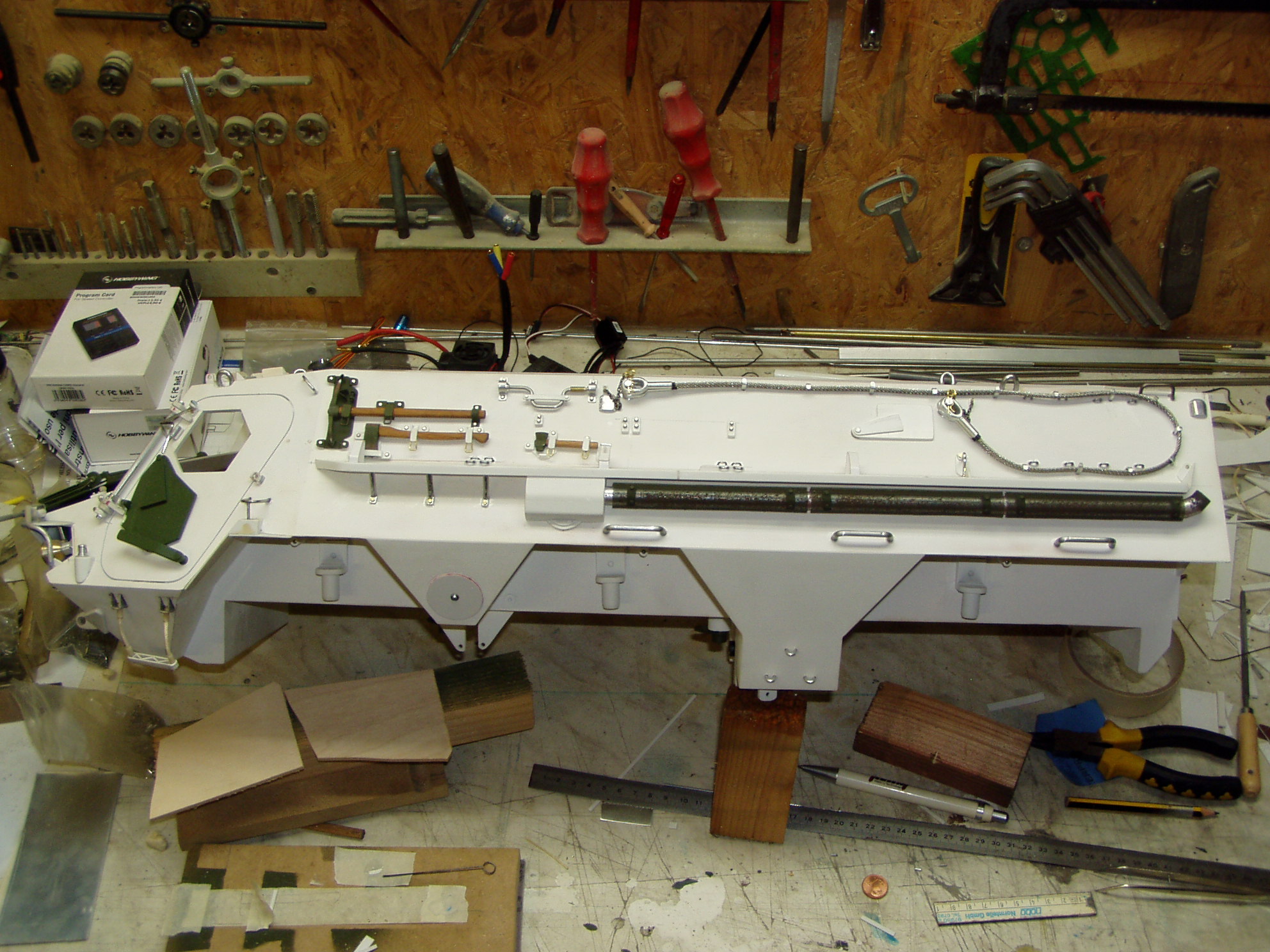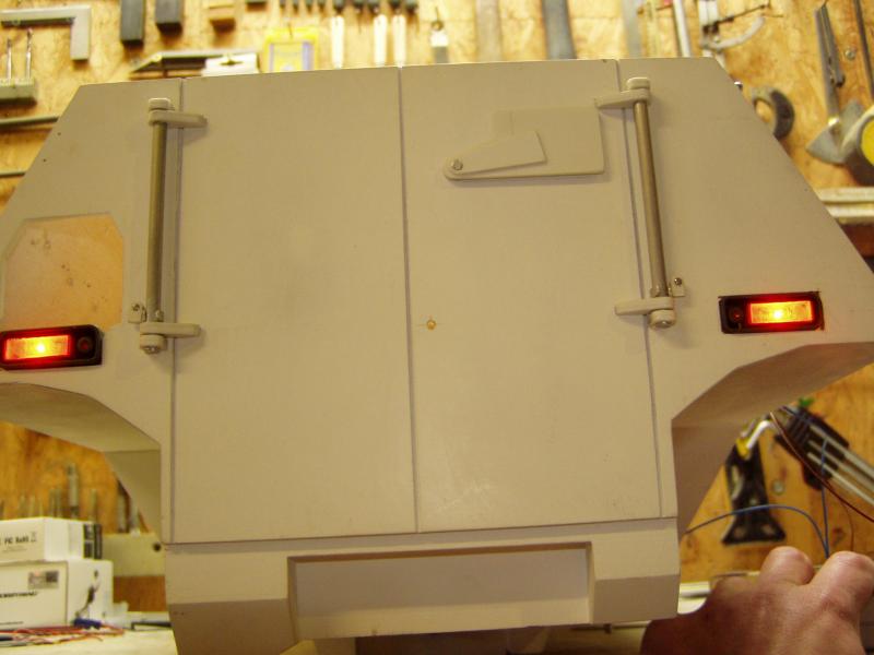 mit dem Heck hab ich schon begonnen, vorher aber nochmals eine Ansicht von rechts. Dazugekommen sind eine Wartungsklappe(?), diverse Griffe und die Anschraubpunkte für Zubehöhr anderer Füchse, die beim SAN nicht gebraucht werden. Die Lage Dieser ist eher geschätzt, weil Bildmaterial fehlt. Säge wurde noch erstellt und diverse Teile grün gespritzt.