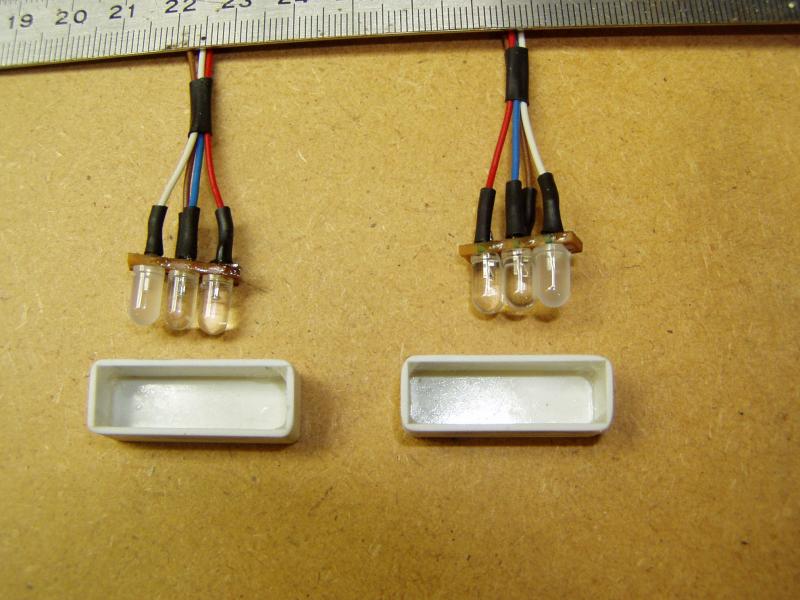 Zuerst einen "Lampenkasten" aus 1 mm ABS gebaut, dieser nimmt später die 3-Kammer-Leuchte auf. Das eigentliche RL besteht aus 3 LED mit gemeinsamer Masse, auf Streifenrasterplatine erstellt. Die LED wurden seitlich etwas abgeschliffen, damit sie ins Raster passen. Auf der Platine jeweils den Plus getrennt, so kann ich sie später einzeln ansteuern und mit Vorwiderständen die Helligkeit beeinflussen. Die LED wurden zuerst auf die Platine geklebt und die Farben der Kabel festgelegt. Aussen Blinker, mitte Rücklicht und innen Bremslicht.