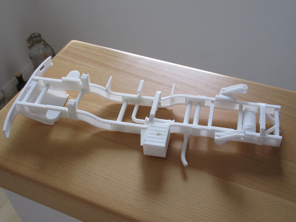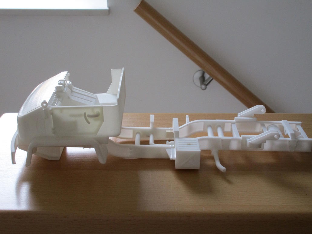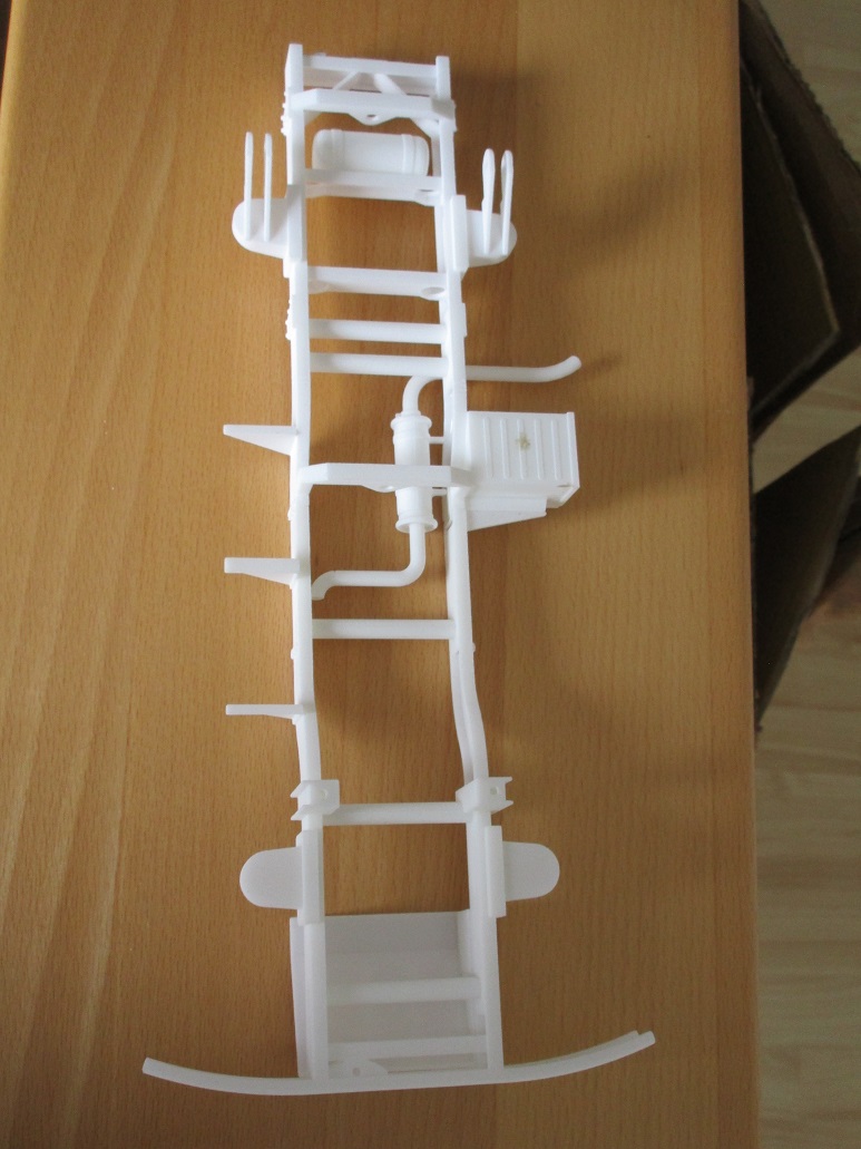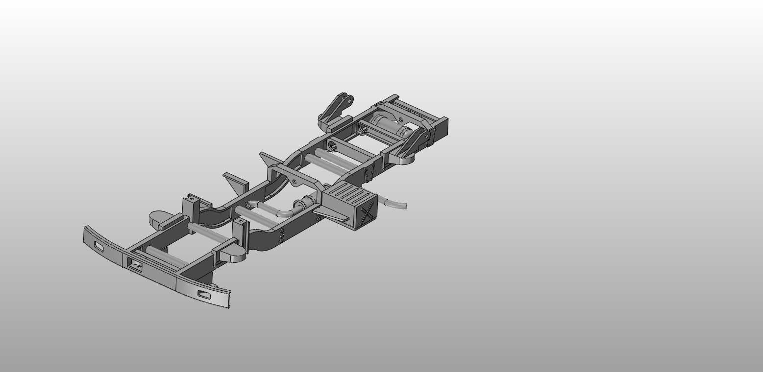 Der Rahmen (Prototyp) ist angekommen. Er ist nur in 2 Teilen zu drucken gewesen. Aber das verkleben mit Cyanacrylat funktioniert super. Stabil genug ist er auch, ich erwarte kein Schwergewicht in 1/16. Jetzt kann ich mit der Anbringung der Achsen etc. beginnen. Bin mal gespannt, sind ja quasi nur auf Federn mit separaten kleinen Dämpfern aufgelegt. Dazu verstrebt.Mal gucken wie ich das angehe. Auf alle Fälle kann es weitergehen.