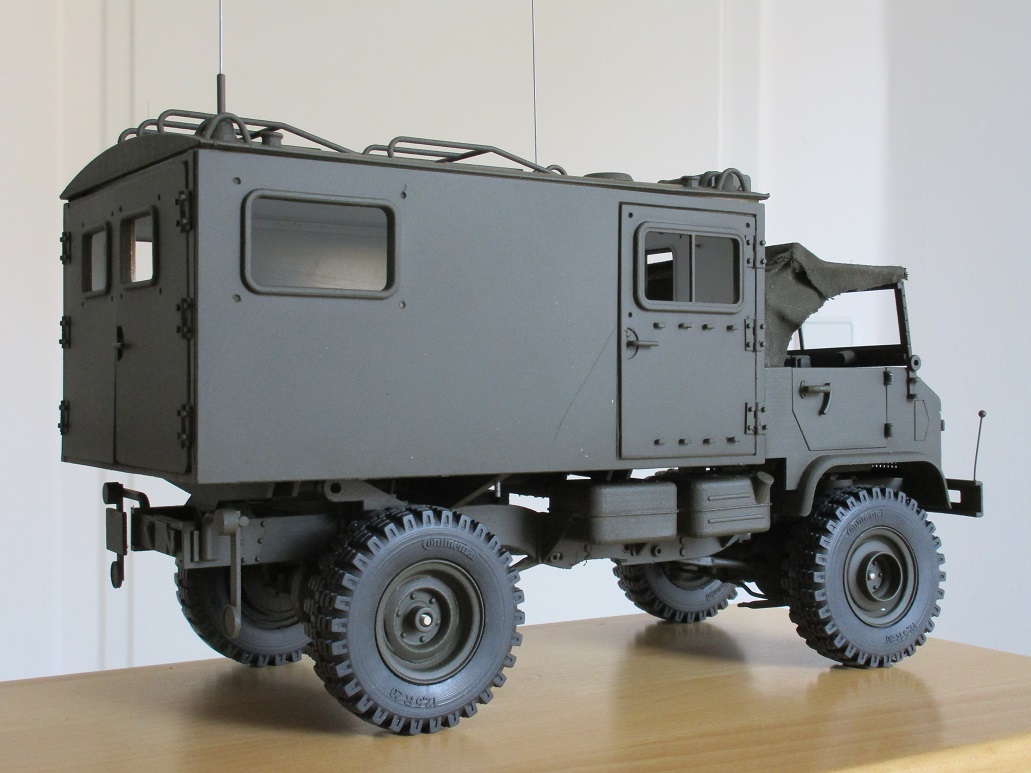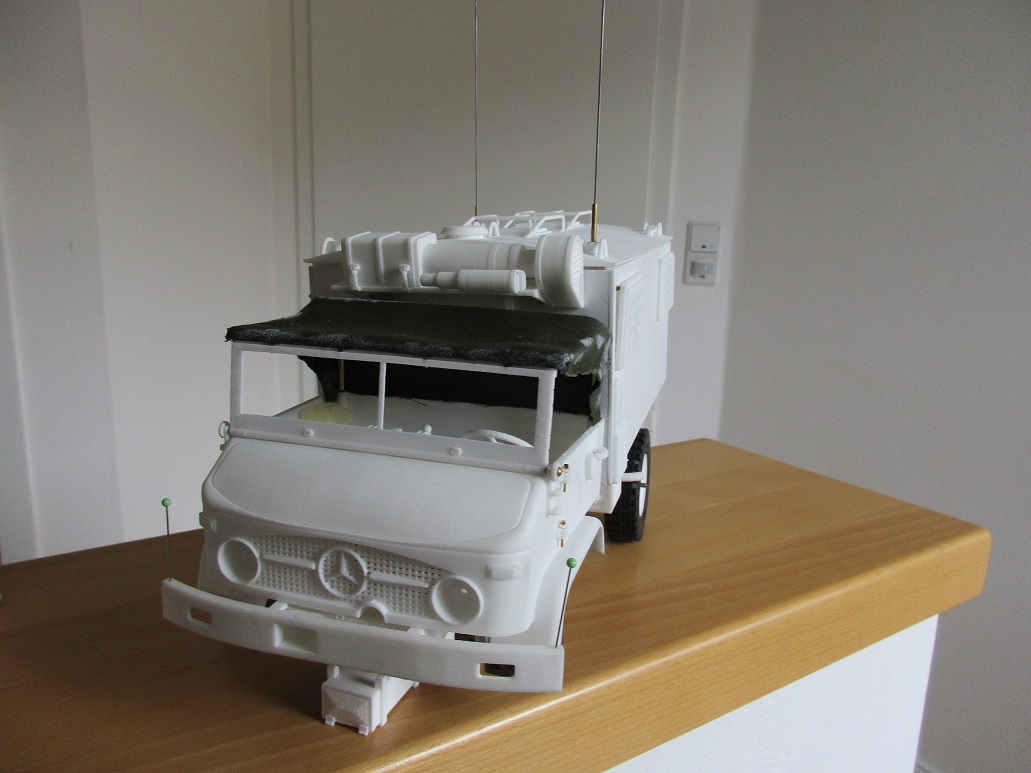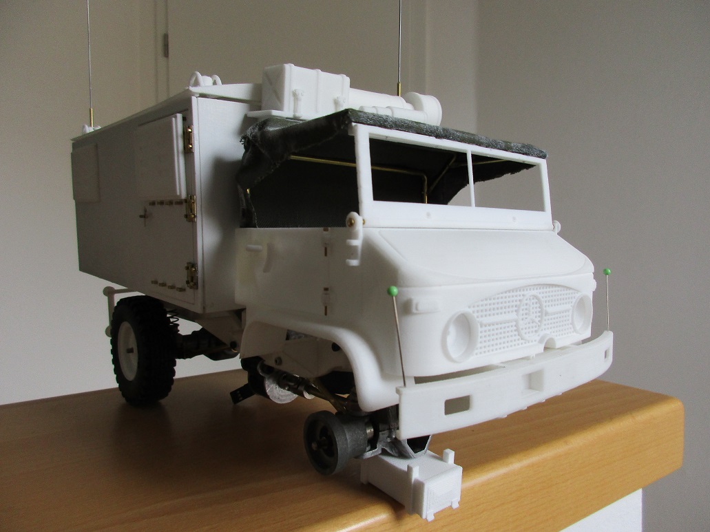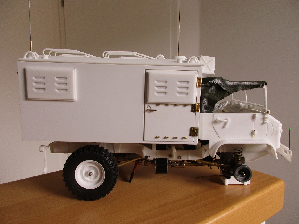 Gestern war mal wieder schönes Basteln angesagt. Ich hab mir eine Halterung für das Lenkservo konstruiert und erstmal provisorisch eingepasst. Am Funkkoffer hab ich die Türrahmen nachgearbeitet so das die Türen vernünftig schliessen. Dazu massive mechanische Hilfen um die Türen zuzuhalten. und mal die abnhembaren Fensterabdeckungen montiert. Sieht so mehr nach Mil.-fahrzeug aus, weniger nach Wohnmobil.