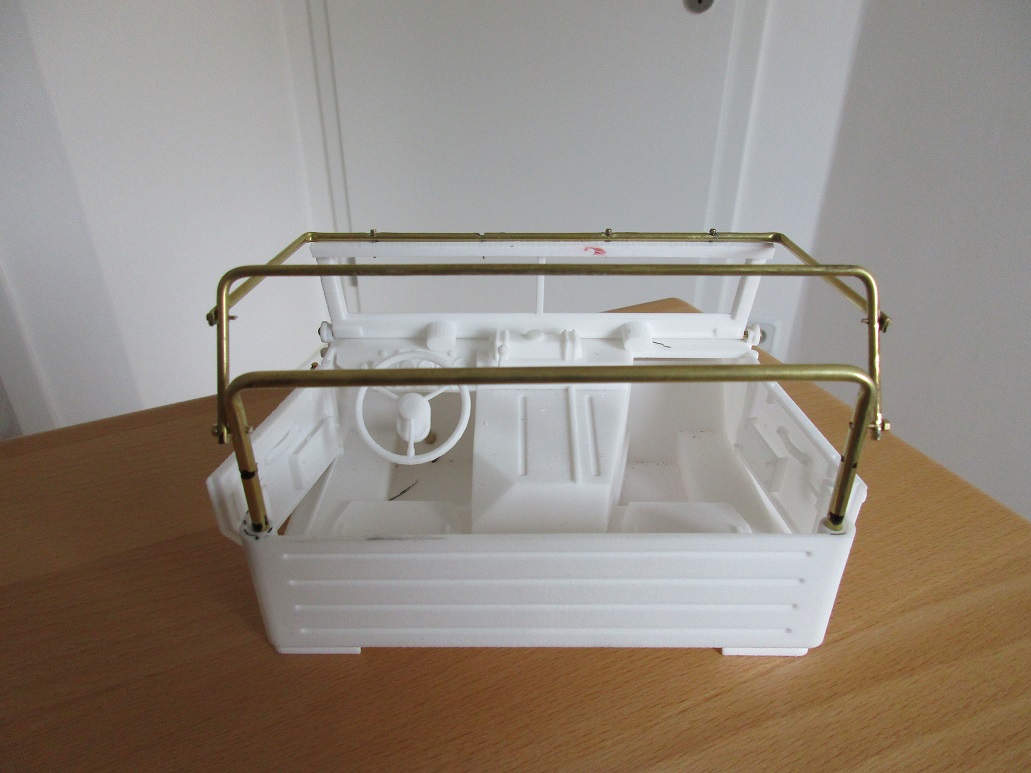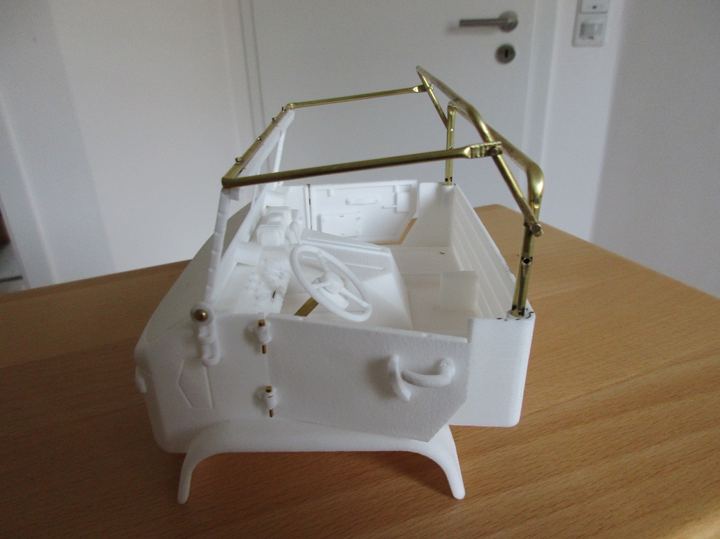 Heute hab ich den ganzen Nachmittag damit verbracht ein Verdeck zu basteln. Ich sag bewußt basteln. Das war mal wieder schönes basteln. Als Material für das Gestänge hab ich Messing- Rohre verwendet, für das Verdeck Teile eines BW Hemdes in 1/16 (Michael, DANKE DAFÜR!)