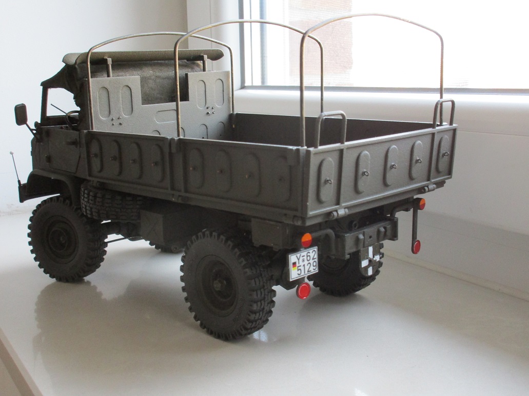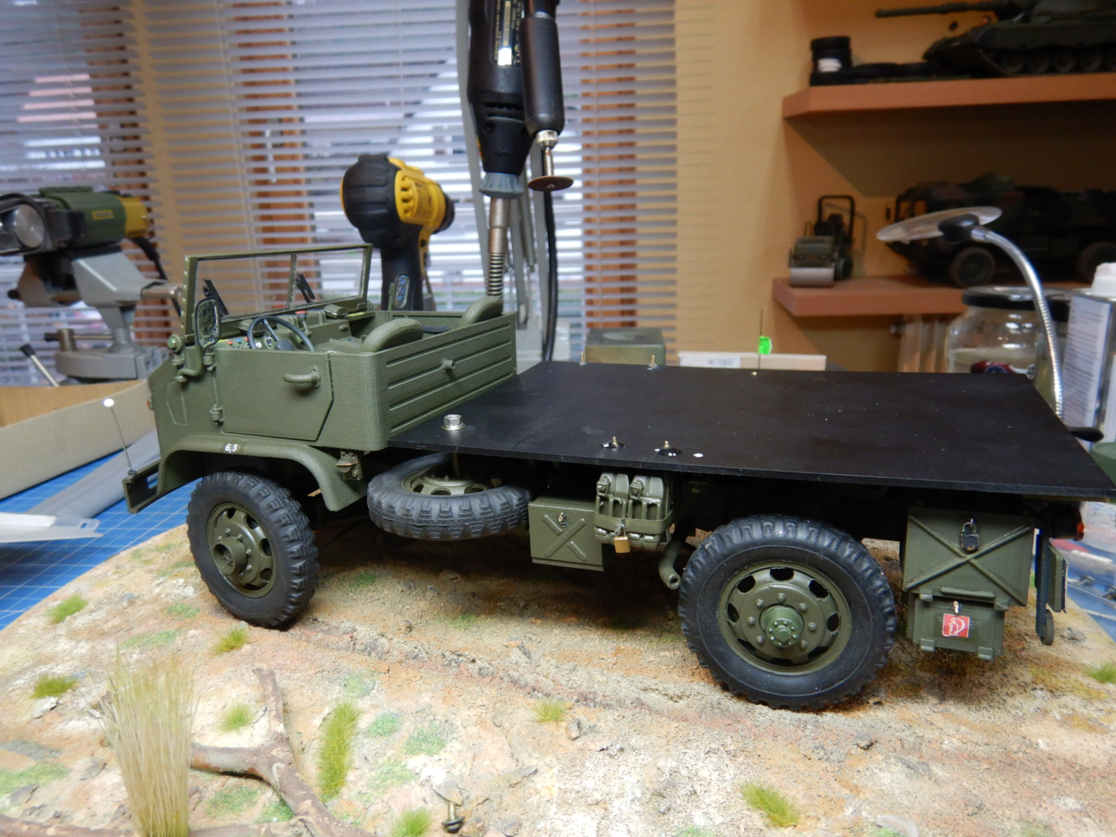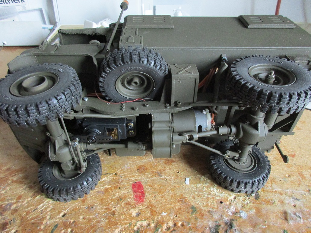 Die Pritsche hat Farbe bekommen. Ja, der Kardan und die Aufhängung brauchen noch etwas Zuwendung. Aber das wird. Übrigens das erste Militärmodell mit einem so mächtigen Spiler. Das Ding muß ganz schön schnell gewesen sein.