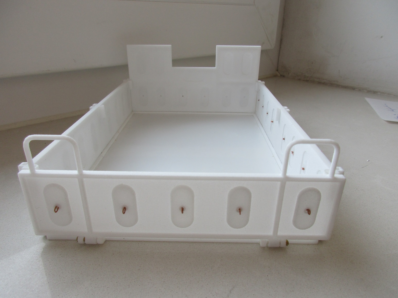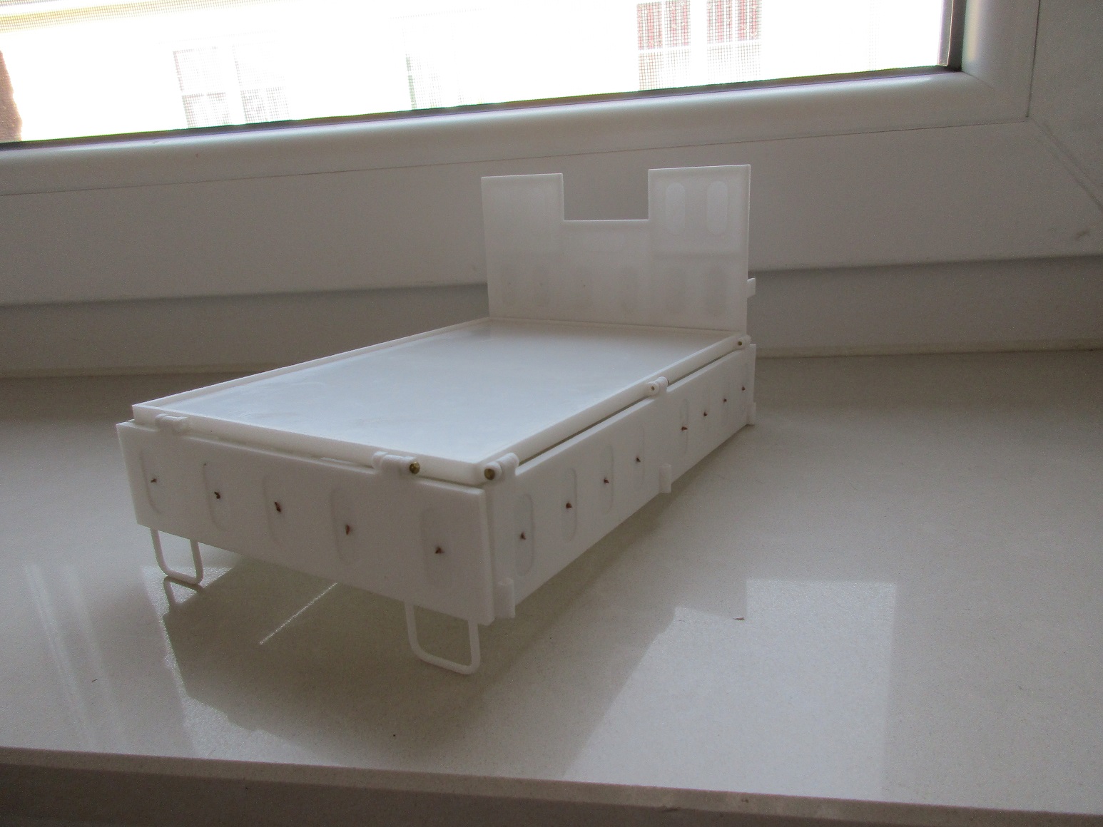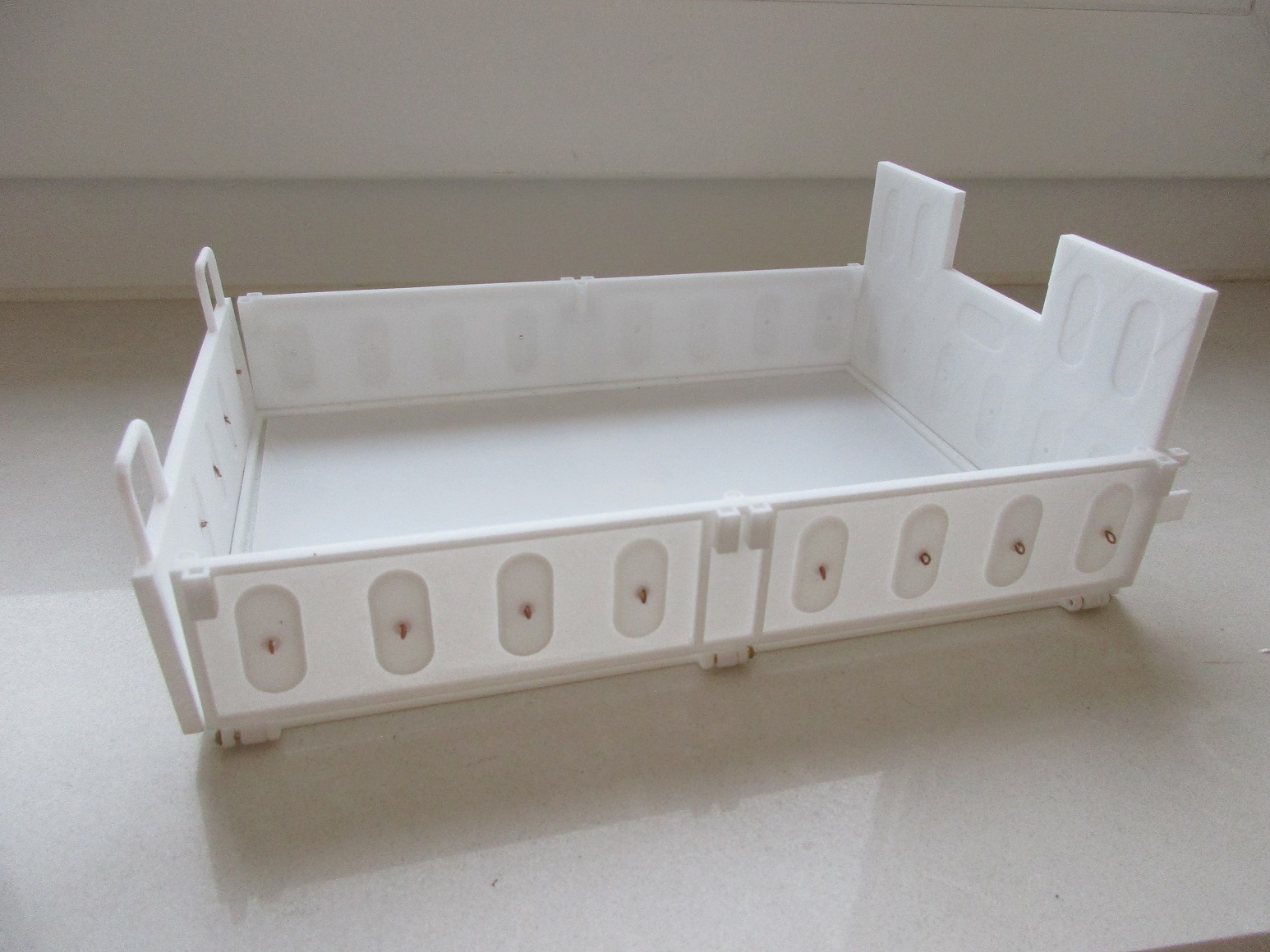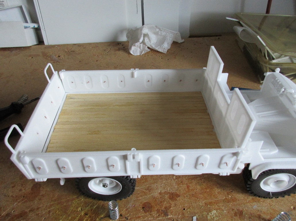 Die Pritsche. Die Wände lassen sich abklappen. Die Ösen sind alle "handmade" mit Draht. Das wär im Druck zu dick geworden. Boden werd ich wieder aus Beplankungsholz machen.