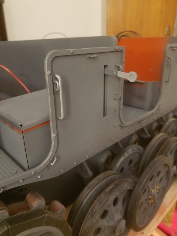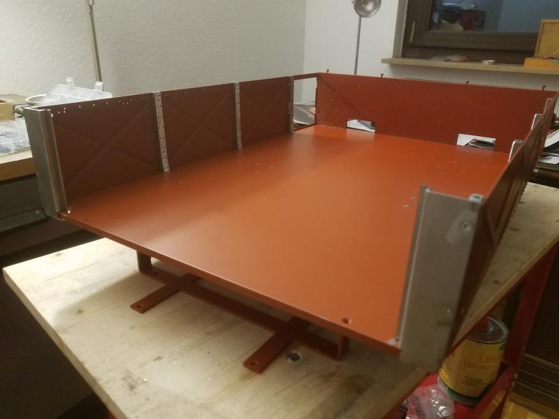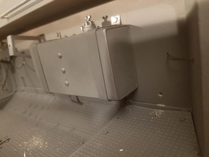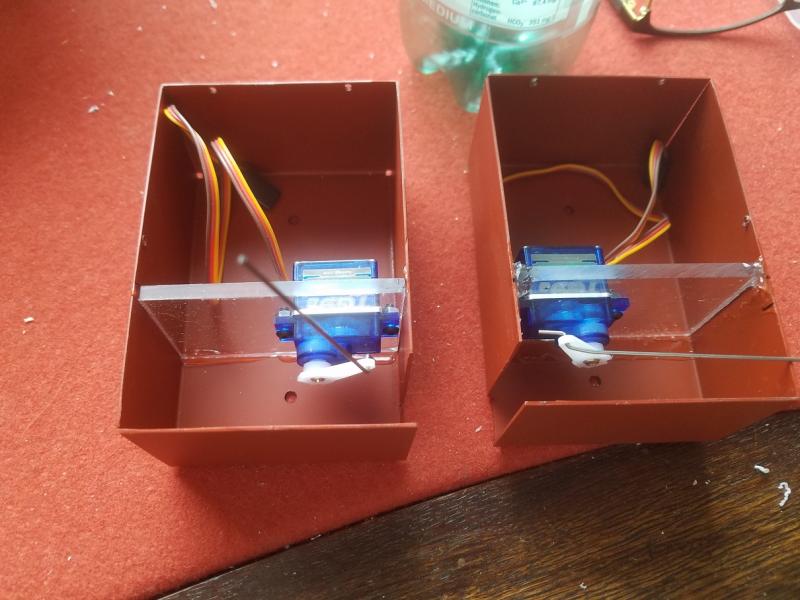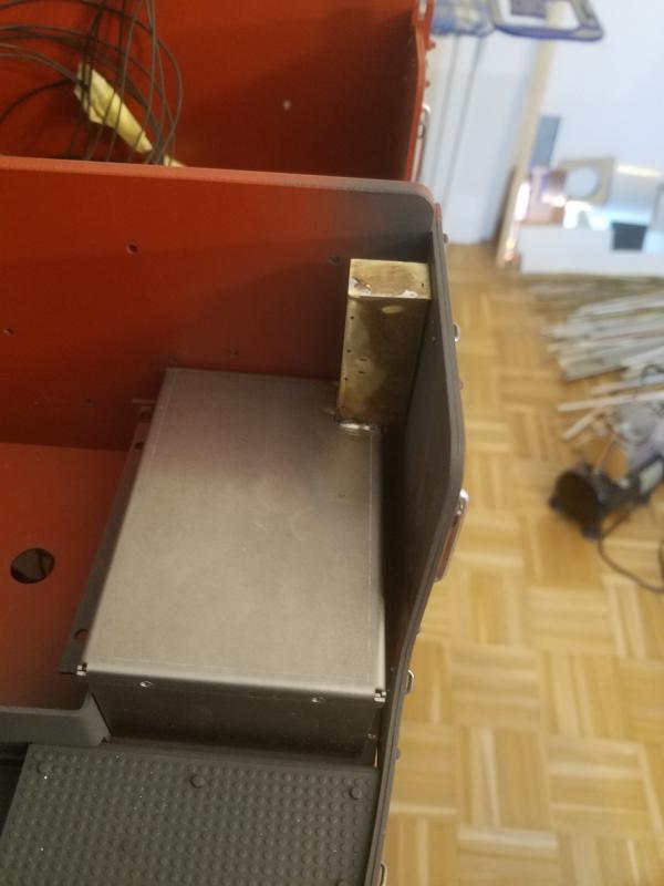 Als erstes sind diese Kisten Bausatzmässig zu hoch und müssen gekürzt werden. Schön ist, dass AT diese Kisten aus Blech mit einem passenden Deckel versehen hat. Im Original sind diese Deckel mit Schrauben an den Kisten verschraubt. Perfekt... genau so umgesetzt. In den Kisten befinden sich jeweils 1 Servo. Wie im Original musste ich dann nur noch die senkrechte Abdeckung der Hebelmechanik fertigen.