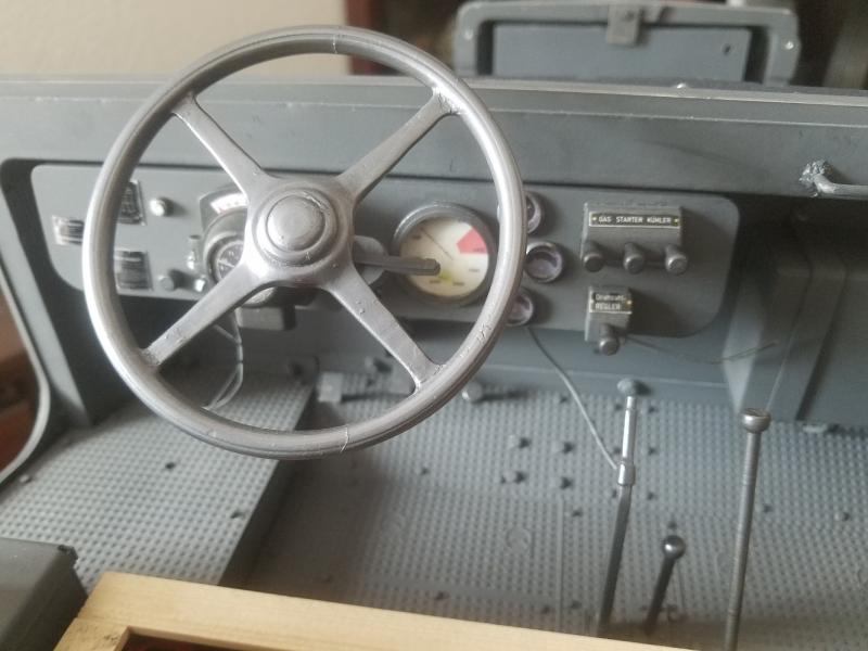 Ein offener Innenraum bringt viel Detailarbeit, die sich aber lohnen wird. Z.B. habe ich den Tank auf der Beifahrerseite detailiert, Das Pockenblech des Bodens mit passenden M1,2 Schrauben verschraubt anstelle das von AT sehr gut gemachte Äzteil nur ein zu kleben. Auch die Schalthebel, Schaltkulisse und Dashboard habe ich im Vergleich zum Bausatz stark verändert.