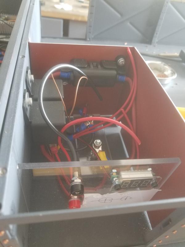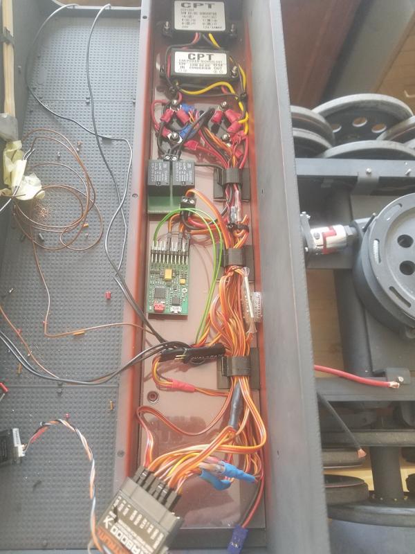 Hier z.B. die Schalttafel meines neuesten Projekts, noch im Bau. Der Hauptschalter ist gleichzeitig ein 60 A-Automat, der für das kleine Modell absolut ausreicht. Die taster schalten Antrieb und Sound getrennt. So kann ich sowohl ohne Sound fahren (etwa zum Verladen) wie auch den Sound bei zuverlässig abgeschaltetem Antrieb aktivieren (Pausenmodus). Der 9-polige PC-Stecker dient zum Balancen der 8 LiFe-Zellen.......