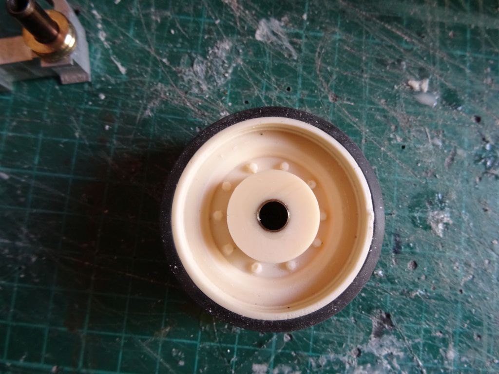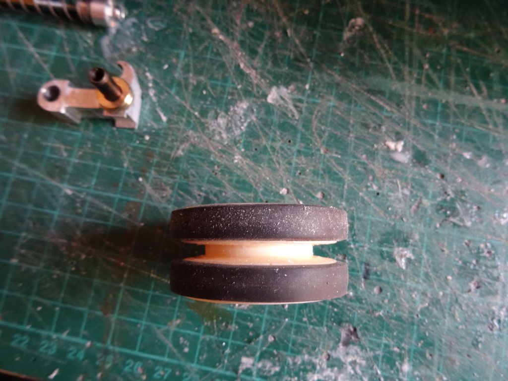 Anschliessend wurde die Teile miteinander verklebt und mit den Tamiya Pershing Laufrollenbandagen versehen ( die Laufrollen haben nun einen Außendurchmesser von 50mm )und mit Messingbuchsen als Lager versehen .