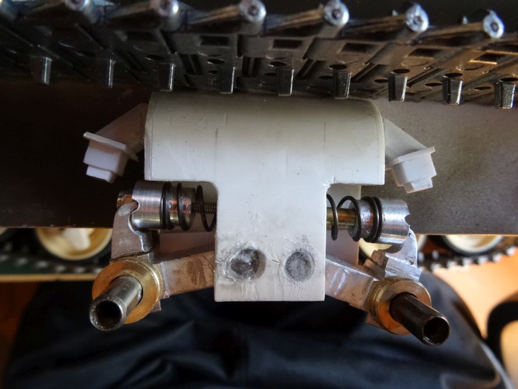 Da der Chieftin keine Drehstabfederung hat sondern eine Konstruktion nach * Horstmann* Prinzip ( zwei Schwingarmen sind in einer Konsole gelagert und zwischen den Haltern auf jedem Schwingarm sitzt dann ein Federbein , das das Einfedern und zugleich auch das Wippen erlaubt ) war hier zuerst etwas Konstruktionsarbeit zu erledigen , damit es auch hinterher richtig funktioniert .