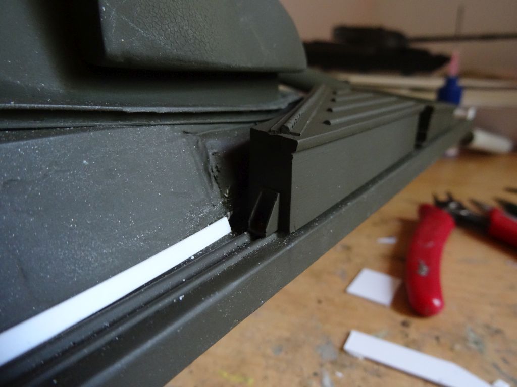 Auch Diese sind aus 3mm ABS hergestellt und die Deckel aus 2mm ABS hinterher aufgeklebt. Die Sicken auf den Staukästen und auf den Kettenabdeckungen sind aus 1,5mm Halbrundprofil von Evergreen und die Schaniere sind aus 1,5mm Runs ABS .