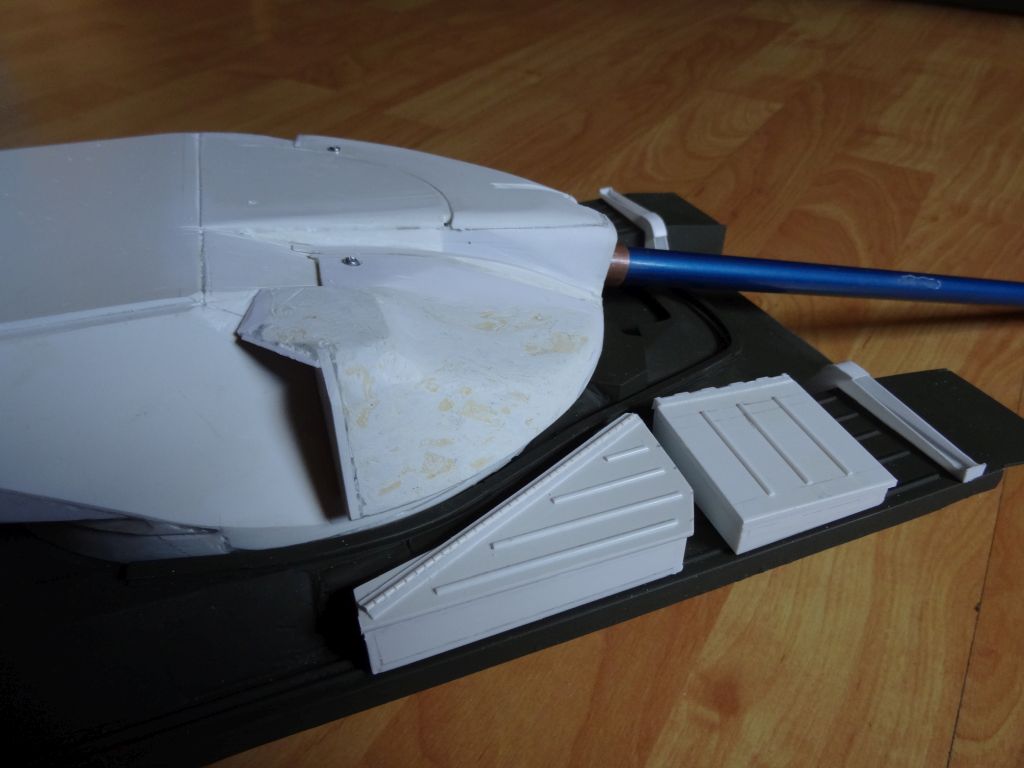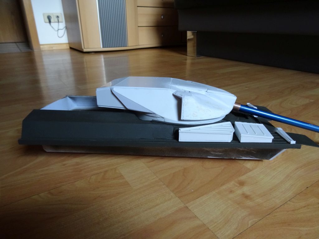 Anschliessend habe ich an der rechten Gruppe die Konsole hinter den Staukästen angefertigt und angebaut , dann das Ganze mit Lack versehen und mal positioniert .