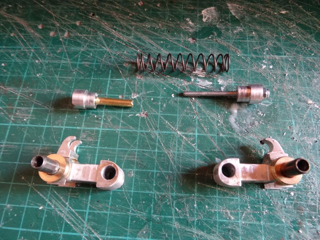 danach wurden die Federbeine aus Alu Rundmaterial 12 mm, 4mm Messingrohr , 3mm Gewindestab mit Mutter und einer Feder aus 0.9mm Federstahl ,einer Länge von 56mm , einem Aussendurchmesser von 10,9 mm und 9,5 Windungen hergestellt .