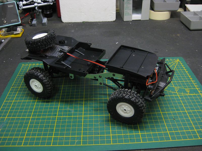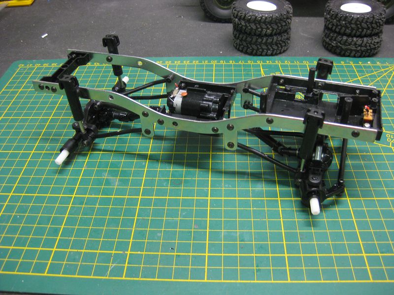 erstmal- wird doch. Was aber n.m.E. unbedingt ab muß vom Rahmen sind die Aufnahmen der Achsanlenkungen (?) die je 2xpro Seite nach unten gehen. Das wirkt schlecht. Und- die MilReifen sind da. Hat Carsten mir noch geschickt. Er möchte schließlich auch einen MOG.