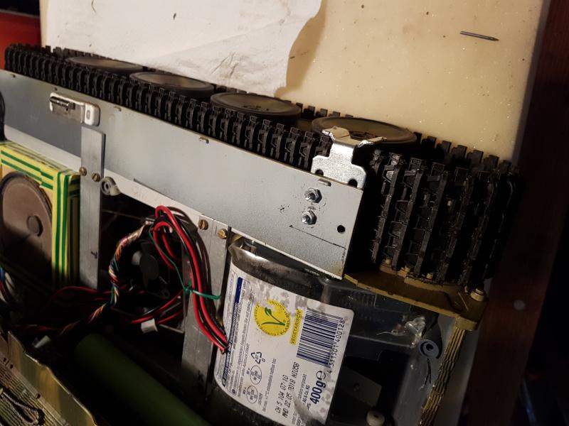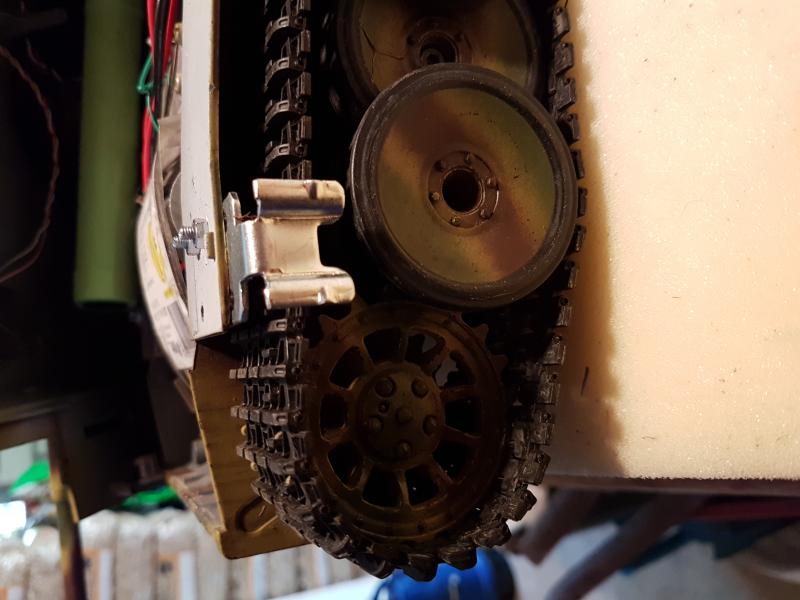Da ich im Garten fahren wollte und das Teil so langsam im Keller einstaubte, baute ich mir ne Kettenführung an beide Seiten...nicht scale, nicht schön...aber funktioniert. Verliert keine ketten mehr im Gras und Gelände und konnte das erste mal ne Akkuladung durchfahren.