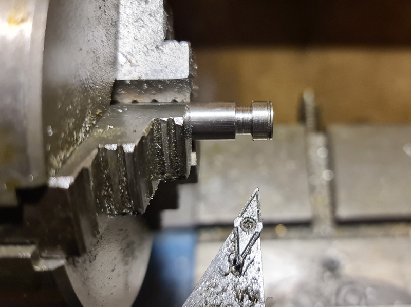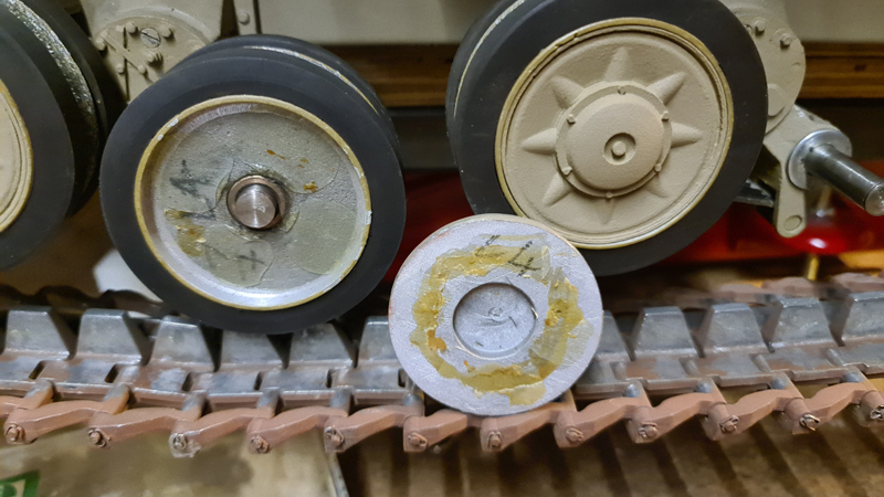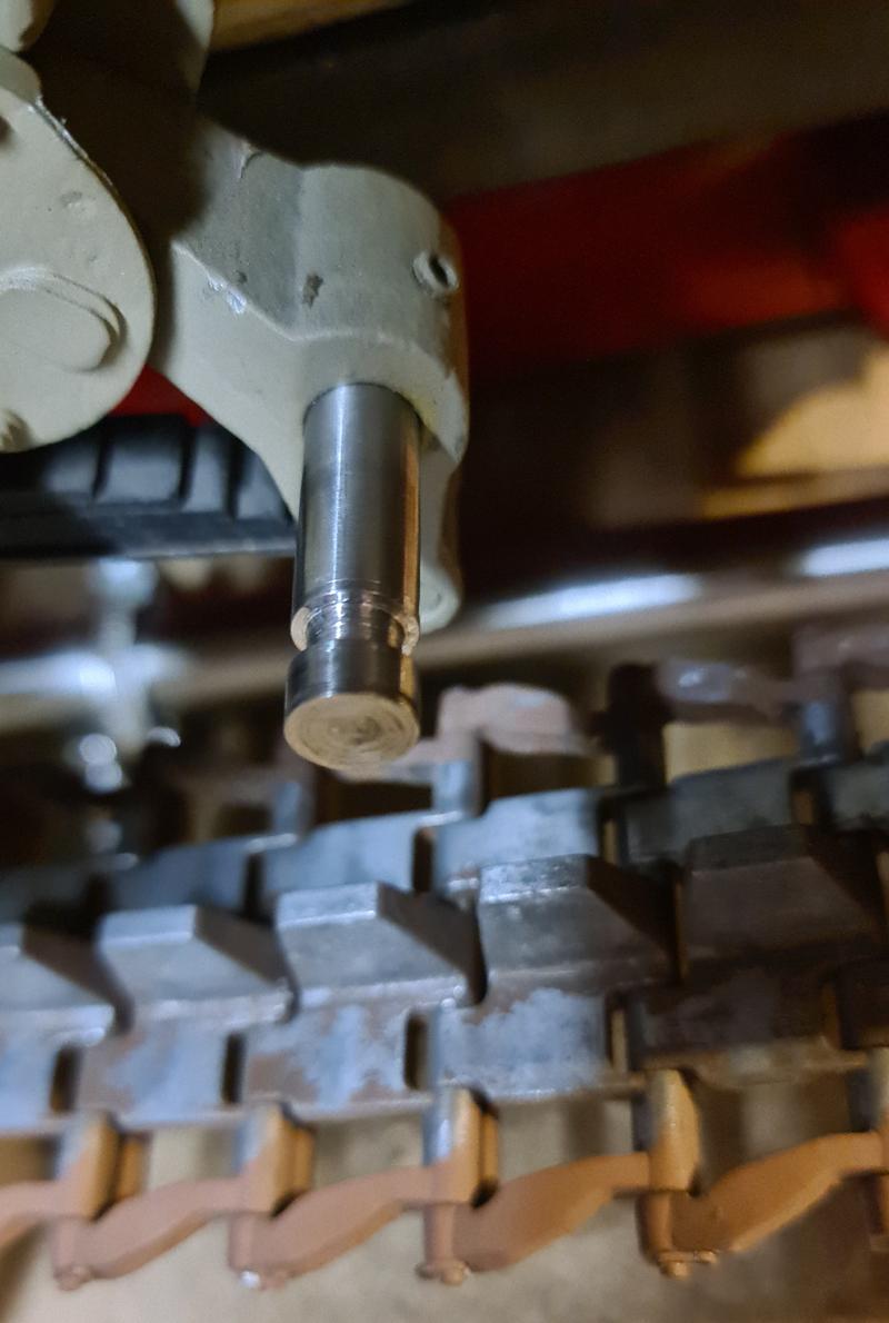 so, kalendarisch ist zwar noch nicht Winter, aber ich habe mich trotzdem schon über die Friederike hergemacht und die 3 defekten Laufrollen-Befestigungen nach dem schon exerzierten Muster umgebaut. Weil meine Lösung ja schon erprobt war, ging der Umbau relativ flott von der Hand. Eine Rolle ist mal zur Probe aufgesteckt; die beiden anderen Achse liegen frei. Die lose aufgesteckte Rolle ist an der abgefallenen Radkappe erkennbar. Sie wäre ausnahmsweise durch erneutes Anbringen des Seegerrings reparabel gewesen; nur hat sich dabei gezeigt, dass die Nut für den Seegerring tatsächlich zu eng gestochen war, was ich ja schon vermutet hatte. Einen derart schmalen Einstechstahl habe ich nicht. Den hätte ich mir eigens schleifen müssen und dieser Aufwand war mir für genau eine Nut denn doch zu viel. Allen anderen Radkappen sitzen "natürlich" bombenfest. Außerdem ist die Laufrolle bei meiner Befestigungsmethode mit Nut und Zapfenmadenschraube jederzeit demontierbar.