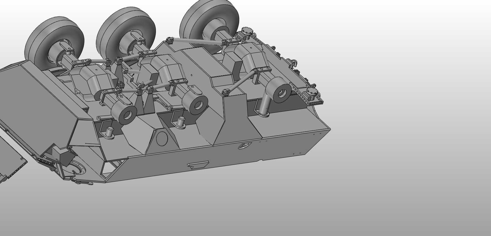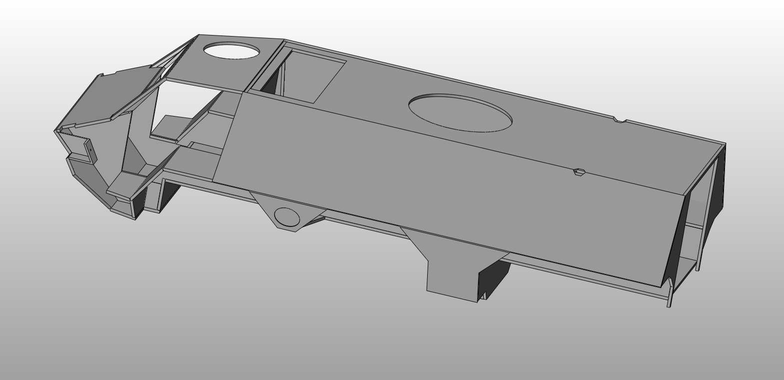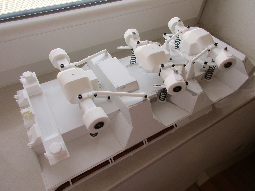 Da ich doch Fragen zu meinen Fahrwerkseilen bekam eine genauere Erläuterung. Analog dem Original (wenn auch nicht "scale") wird jede Achse mit einem Dreieckslenker mittig gehalten. Dazu je zwei Längslenker damit das alles ein- und ausfedern kann. Die Aufnahme der Federn erfolgt über Dome die an der Wanne sind (das Bild ohne Schrift).