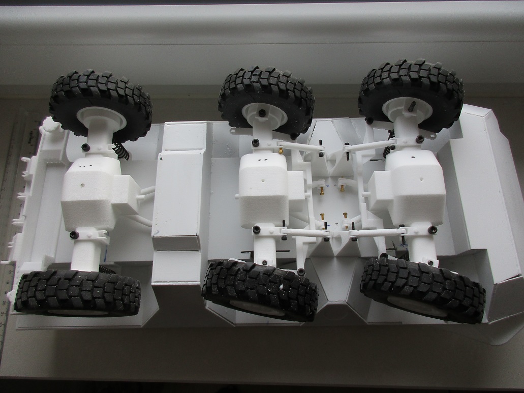 Die beiden vorderen Achsen sind beweglich/ lenkbar. Aufnahme der Felgen über Kugellager. Dimension der Achsen entspricht Veroma LKW Achse 1/16