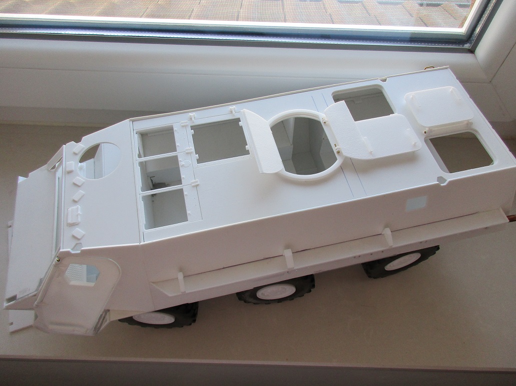 Karosse 2 ist fertig. Die rechte Tür und das Dach etc. lasse ich noch unbefestigt bis alle Teile platziert sind. Das Fahrwerk ist auch erstmal soweit das der Fuchs auf seinen Achsen stehen kann. Für RC Betrieb müssten meine DummieAchsen gegen andere zum bsp. veroma getauscht und natürlich ein entsprechender Antrieb eingebaut werden. Ein Lenkservo zwischen den Vorderachsen sollte die Lenkung bewegen. Das würde ich aber evtl. Interessenten überlassen.