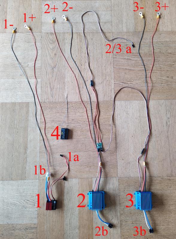 Ich bin fast einverstanden mit der Antwort, nur sehe ich den Fahrtregler 1 für den Kanonenantrieb, nicht für den Turmantrieb. Die Bigtanks-Panzer haben fürs Turmdrehen ein umgebautes, endlos drehendes Servo, das man direkt an den Empfänger anschließen kann.
