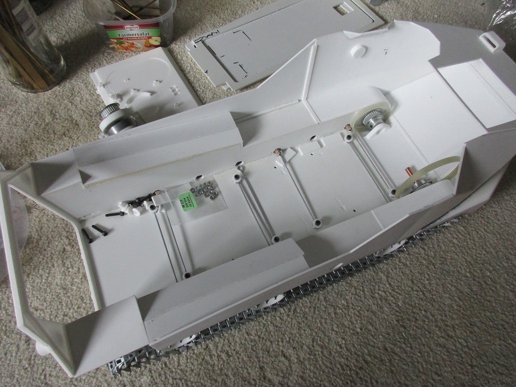 Das Fahrwerk funktioniert. Abgekupfert beim Tami Leo2 mit den Drehstäben und Metallschwingarmen macht das einen brauchbaren Eindruck.