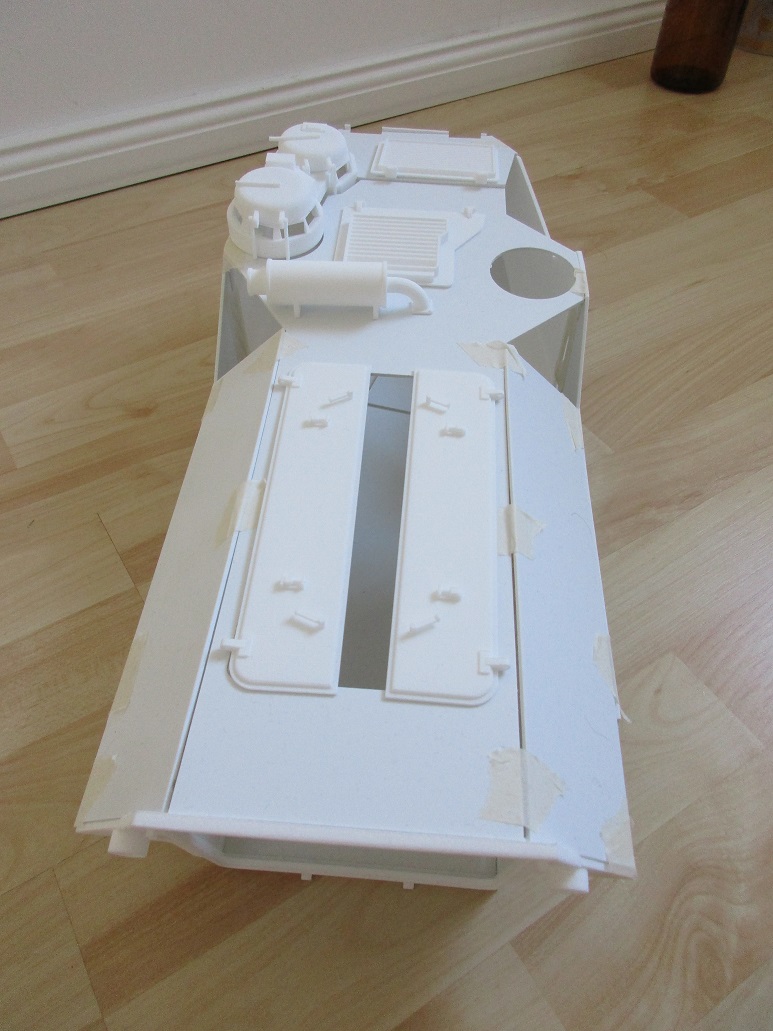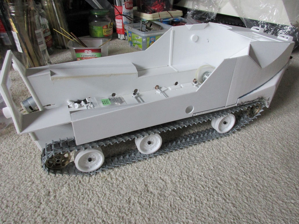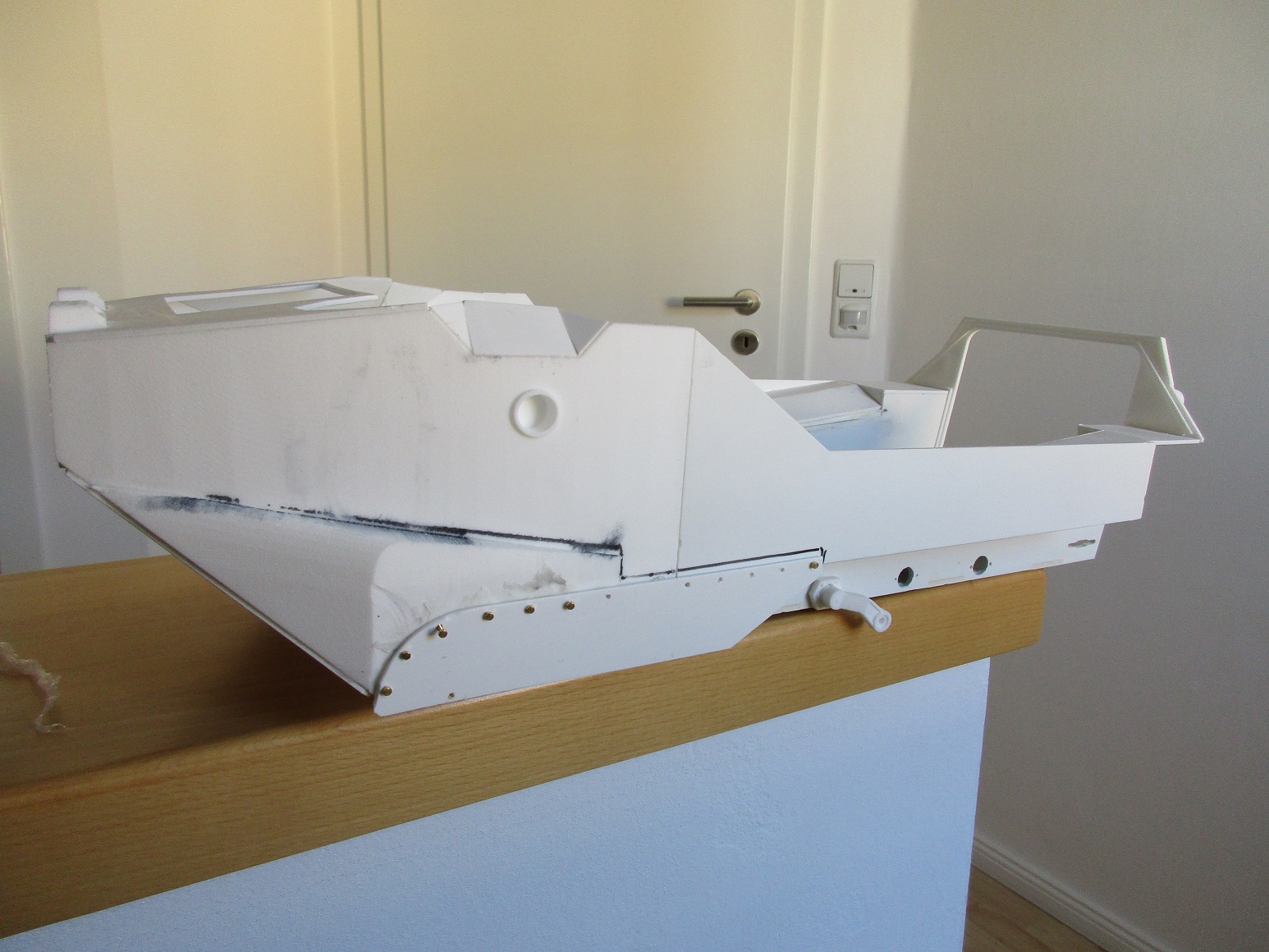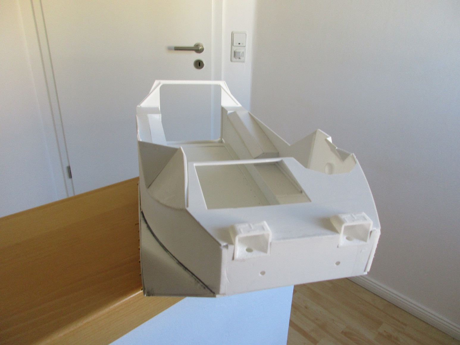 Den Rumpf hab ich mal verklebt. Soweit so gut. Die schrägen Wände des Aufbaus lasse ich noch weg da man so noch gut an alles drankommt.