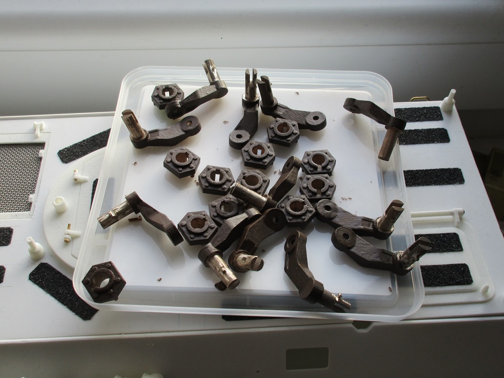 Die Schwingarme und ihre Aufnahmen hab ich mit der besagten Rostschutzgrundierung versehen. Ging besser als ich dachte, stank aber ziemlich. Und den Pinsel kann man hinterher wegwerfen. Nachher werd ich mal an einem probieren was passiert wenn man da Acryllack draufppinselt.