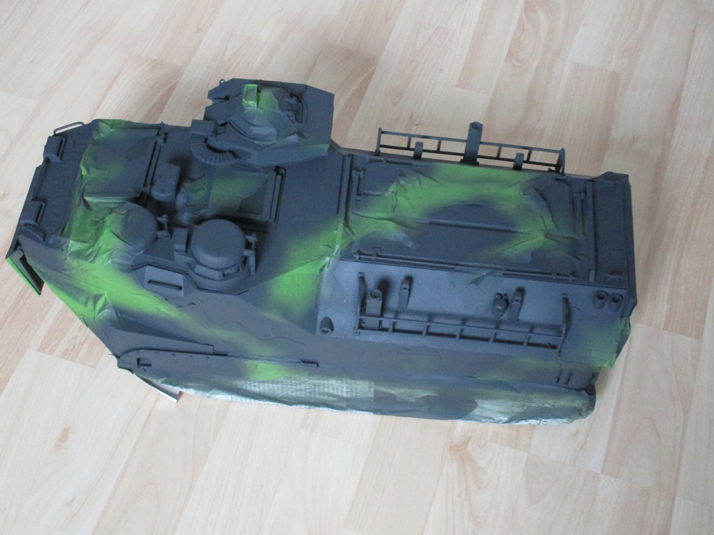 Dank schönem Wetter hab ich mit der Lackierung begonnen. Farbe NATO Grün Tamiya aus der Spraydose. Das weitere Tarnschema wird gebrusht.