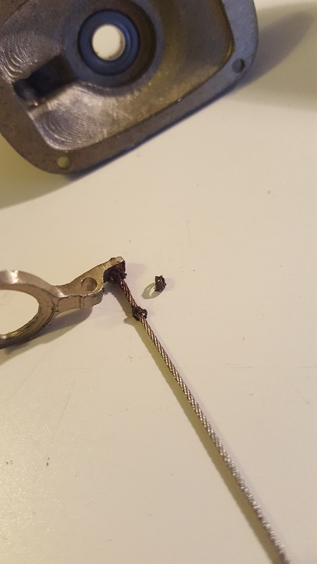 In einem Baustellen-Forum habe ich einen Beitrag von TOM aus dem Jahre 2009 gefunden, wo von einer Rückstellfeder am Bowdenzug die Rede war. Also mal die Achse zerlegt und folgendes Vorgefunden: