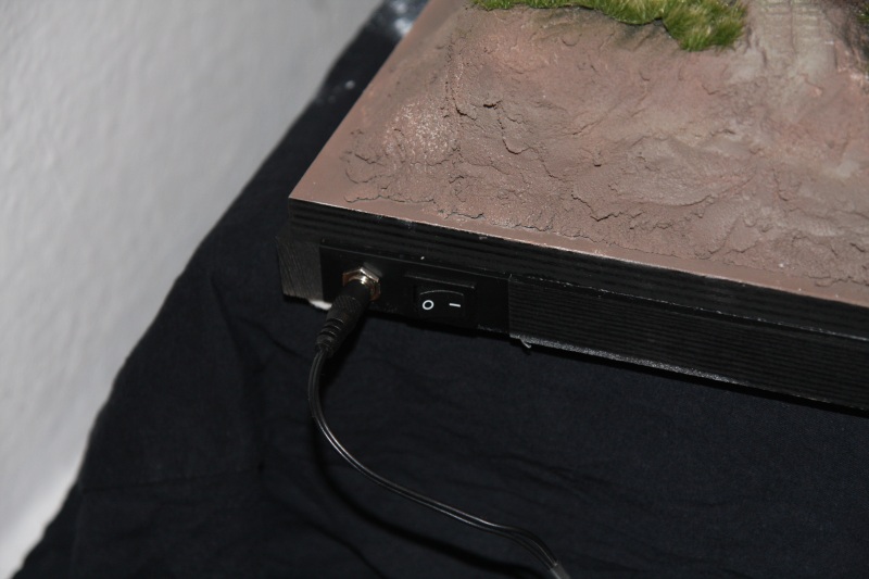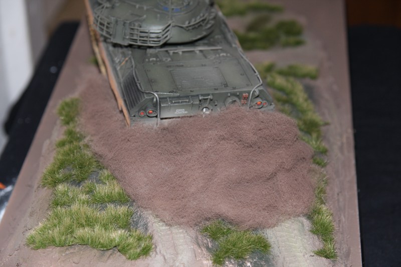 Während ich zur Darstellung des Mündungsfeuers noch normale Watte benutzt habe, besteht der \\\"Staub\\\" aus Füllwatte aus dem Bastelbedarf für Stofftiere, etc. Diese Synthetikwatte ist deutlich luftiger, dadurch voluminöser und lies sich super mit Airbrush einfärben. Die Base besteht aus einer Holzplatte, das Plateau aus mehreren Schichten 10mm Styroporplatte (war das einzige, was im Baumarkt noch da war) und 1kg Moltofill-Holzreparaturspachtel. Man kann natürlich auch billigen Gips nehmen, der trocknet mir allerdings zu schnell. Dann noch etwas Farbe, Grasbüschel aus dem Dioramenzubehör und zwei kleine Pfützen aus Flüssigresin.
