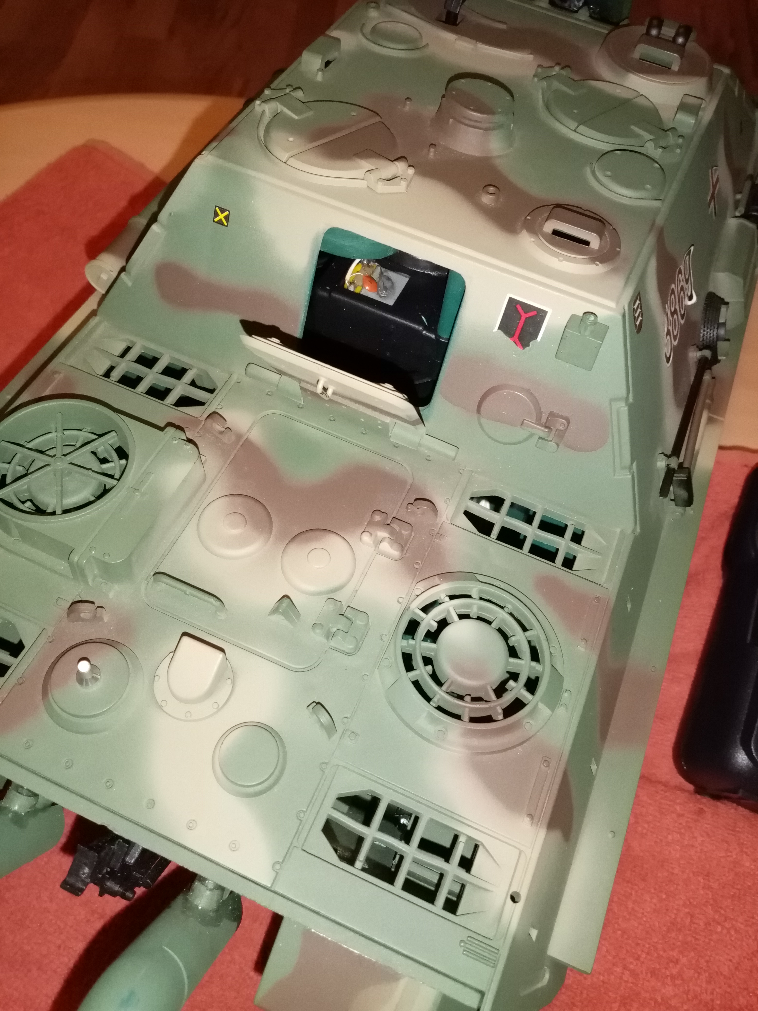 die Heckklappe der Jagdpanzer lädt ja auch richtig dazu ein, dort die Bedienelemente unterzubringen. Bei den Großmodellen ist das genauso. Hauptschalter, Fahrtaster, Sound, Ladebuchsen, Sicherung; alles läßt sich dahinter bequem erreichen.