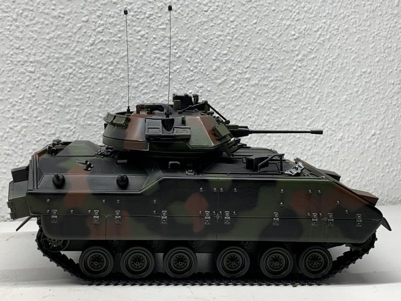 ich bin neu in eurem Forum, bzw. war lange Zeit nur stiller mit-Leser und will mich und mein Projekt mal „kurz“ vorstellen. Zuerst zu mir: Mein Name ist Dominique ich bin 28 Jahre alt und ich komme aus der Nähe von Heidelberg. Normalerweise bin ich im 3D Heli und vor allem Crawler Bereich unterwegs. Jedoch wollte ich mir schon länger einen Panzer zulegen, weniger um wirklich damit zu fahren, als es mir selbst zu beweisen und ein solches Ungetüm auf die Beine stellen zu können. Da meine anderen beiden RC- Hobby bereits viel Geld verschlingen wollte ich zudem auch nicht gleich in die Tausender gehen und eher ein kleines low-budged, nebenher Projekt starten. Da ich ein Fan von „moderner“ Technik bin, schieden also gleich mal Panzer auf dem WWII aus. Deshalb musste was Modernes her. Leopard A2, Abrams, sowas in der Richtung halt. Hier gibt es ja einige nette Bausätze, aber irgendwie wollten dir mir alle nicht so zusagen und auch optisch waren die beiden Panzer nicht meins. Also das war schon kompliziert, modern, günstig und nichts von der Stange, naja eine eher ungünstige Kombination und eigentliche zum Scheitern verurteilt. Jedoch bin ich dann durch euer Forum auf meine Lösung gestoßen: auf eine der hinteren Seite, ein Beitrag von Dirk Kisten aka. scenic99, ein Bradley IFV!!! Son Ding muss her, das will und brauche ich. Grundmodell war ein 1/16 Standmodell/ Spielzeug, zwar relativ detailreich, aber halt ein Spielzeug und nicht dafür ausgelegt, dass man hier eine RC-Einheit unterbringt. Also eigentlich eine gute Basis, relativ günstig, nichts von der Stange, es gibt kaum Berichte darüber und gefällt mir richtig gut. Tja Pustekuchen, diese Bradley Spielzeuge gibt’s wohl kaum bzw. gar nicht mehr! Also wurde das Projekt wieder ad acta gelegt. Doch es hat mich einfach zu sehr gereizt sowas umzusetzen. Nach monatelangem Suchen habe ich dann doch einen Bradley in Holland bei einem Modellbauhändler gefunden. MEGA, Preis war vertretbar, Versand war günstig, lediglich die OVP hat gefehlt. Das Ding musste her. Paar Tage später stand der Bradley dann bei mir. Man eh schon das Spielzeug sah meiner Meinung nach super aus. Gleich mal an die Arbeit gemacht und das Ding zerlegt, den Beitrag vom Dirk parallel geöffnet und ab ging die Post. Naja bis ich feststellen musste, dass das nicht so einfach ist. Meine Panzer-Kenntnisse und mein Panzer Know-how ebenso wie meine Teilkiste an Panzerteilen ging gegen 0. Beim Dirk Kisten sah das so einfach aus. Naja aufgeben ist nicht. Ich fand in einem anderen Forum einen Beitrag wo jemand das gleiche Modell „einfach“ auf einen Panzer III setzte. Also eine Panzer III Unterwanne nebst Metallgetriebe gekauft. Naja ihr könnt euch bestimmt denken was los war, passt vorne und hinten nicht. Der Panzer III ist ein gutes Stück kürzer und nach scaligem Fahrwerk sah das auch nicht aus. Also erneut ein Griff ins Klo. Nochmal zurück auf Anfang, den Beitrag genauestens studieren und Teile kaufen wie es beim Dirk gemacht wurde. Also Schwingen vom Tiger aus Metall gekauft damit wenigstens mal das Fahrwerk vorankommt. Danach habe ich die Bilder aus dem Baubericht entnommen und mit Maßstab versehen und so genau es eben ging nachgebaut. Da ich aber nicht einfach „nur“ abschauen wollte und im Vergleich zu meinem Vorbild, welcher den Panzer 2013 gebaut hatte, einen entscheidenden Bau-Vorteil hatte: 3D Drucker und etwas CAD Kenntnisse habe ich meine Schwingen Kugelgelagert und habe die originalen Laufrollen, auch mit Kugellagern übernehmen bzw. umbauen können. Nach einigen Tagen Arbeit, war es dann so weit und BAAAAMMMM das hat zum ersten Mal funktioniert: mein Panzer stand auf federnden, Kugelgelagerten Metallschwingen und Laufrollen. Da ja immer noch low-budged angesagt war und der Dirk welchen ich bis dahin natürlich bereits kontaktiert hatte mir leider nicht mehr genau sagen konnte was für ein Getriebe usw. er verwendet hat, ist ja auch schon eine Weile her, stand für mich fest, dass Panzer III Getriebe muss da rein, komme wie es wolle. Nach einigem hin und her und 3D Konstruktionen habe ich das schlussendlich auch geschafft. Das Getriebe war drin! Die Frontplatte der originalen Wanne hatte allerdings auf Grund von Platzproblemen mit dem Getriebe etwas gelitten und so kam erneut der 3D Drucker zum Einsatz und eine neue Platte wurde als Blende erstellt. Fazit bis hier hin, über 1 Jahr Arbeit von der Idee bis zum „Roller“ wie wir Crawler sagen, wenn das Fahrgestellt steht. Zudem die Erkenntnis, dass der Dirk Kisten ein riesen Modellbauer ist und ohne meine Geschummel mit dem 3D Drucker das alles vor 8 Jahren bereits und wahrscheinlich besser realisiert hat. An dieser Stelle Hut ab, aber ich war nun auch sehr zufrieden mit meiner Leistung. 0 Plan von Panzern gehabt, aber ein, so denke ich zumindest, sauberes Fahrwerk/Unterwanne auf die Beine gestellt. Nächster Schritt: ELO. Da mein Panzer III Getriebe bereits 540er Typ brushed Motoren verbaut hatte fehlten noch Regler und Empfänger. Da ich aus dem Heli Bereich eine 6 Kanal Knüppelfunke habe, wurde dieses also herangezogen. V-Mischer programmiert, zwei (gleiche) brushed Regler organisiert, Spektrum Empfänger rein und los ging es. Naja fast, bis der V-Mischer das Tut was ich will vergingen einige Stunden, aber nun kann ich einigermaßen scalig Panzer fahren. Mein Rechter Knüppel (Mode 2) steuert Vorwärts/Rückwärts und links/rechts. Mit passenden EXPO und Dual-Rate Einstellungen kann ich ihn sogar kontrolliert um Kurven fahren lassen und auch auf der Stelle drehen ist möglich. Allerdings sind wohl die Regler nicht ideal da er zwar auf der Stelle dreht, aber die Ketten nicht gegenläufig Laufen bzw. erst sehr spät anfangen dies zu tun, naja damit muss ich wohl (vorerst) leben. Nachdem nun der „Panzer“ ohne Oberwanne fährt und ich einigermaßen zufrieden war, ging es nun mit der Oberwanne weiter. Hatte ja theoretisch noch 3 Kanäle für im Empfänger frei. Der Plan war also TOW hebe