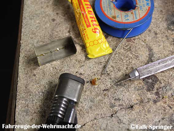 In diesem Bild ist schon alles erklärt. Das kolophoniumhaltige Weichlot unterstütze ich mit Löthonig als Flußmittel. Vorteil: es sorgt nicht für Korrosion, denn nicht bei allen Bauteilen kommt man später gut an alle Stellen der Lötung zum restlosen Versäubern. Und der Skalpell dient dazu, kleine Stücken vom Lot zu schneiden.