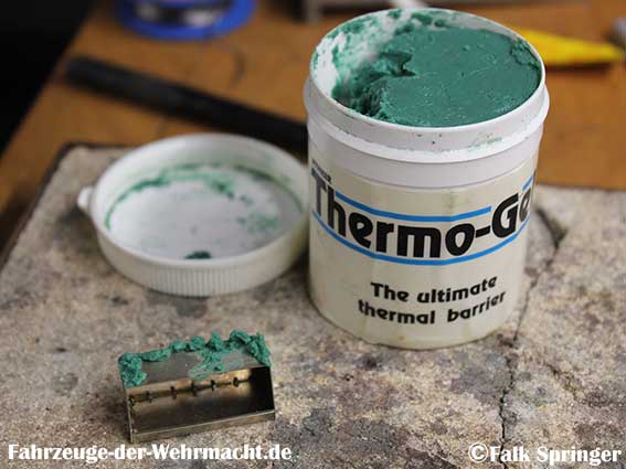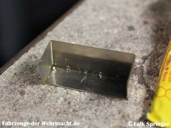 Manchmal stellt sich die Frage, wie man auf engem Raum mehrere Lötungen durchführt, ohne daß alles wieder zerfällt. Man kann mit Loten unterschiedlicher Schmelztemperatur arbeiten, oder aber muß selektiv kühlen. Oft genügt es, andere metallische Teile aufzulegen, oder Klemmpinzetten anzubringen, damit die Wärme abgeführt wird und dort nicht die Schmelztemperatur des Lotes errreicht werden kann. In anderen Fällen hilft sogenanntes Thermo-Gel, von welchem ich vermute, daß es nichts anderes als eingefärbte Maisstärke ist. Auf dem Bild sieht man, mit welch geringen Mengen man damit auskommt. Hier wurde die Rückwand angelötet und die Naht der vorderen Seite mußte gekühlt werden. Das Thermo-Gel nimmt dort die Wärme auf und schrumpelt zusammen.
