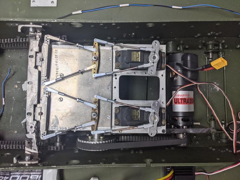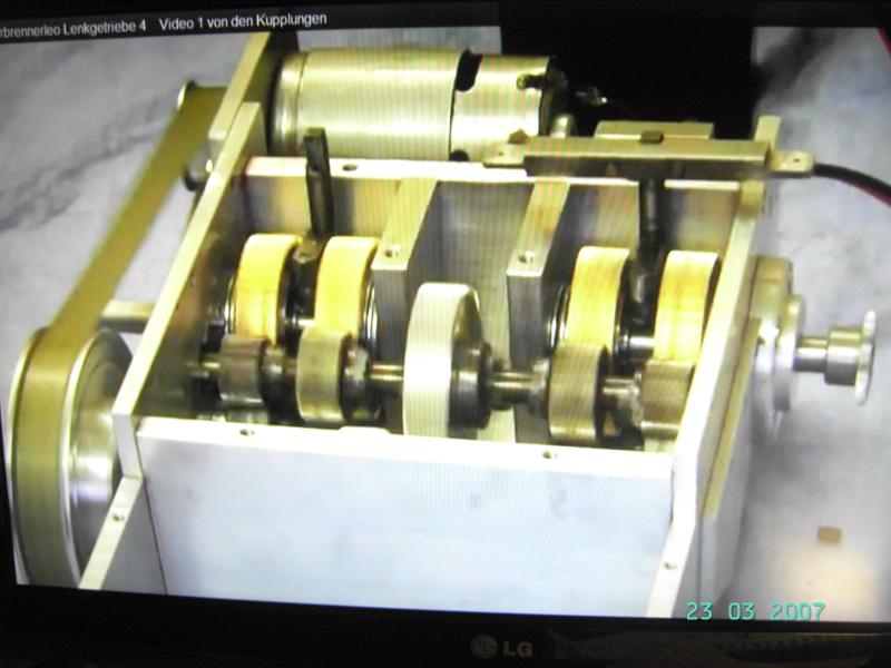 Daher tippe ich auf ein Lenk-Getriebe, bei dem mittels Differentialen und Bremsen die Drehzahl der Eingangswelle auf die Ausgangswelle verteilt werden. Möglicherweise war das Getriebe sogar ursprünglich für einen Benzinmotor, und einer der Servos war für die Umschaltung Vorwärts/Rückwärts vorgesehen, und der andere Servo zur Lenkung. Später wurde der Bezinmotor ausgebaut und durch einen Elektromotor ersetzt.