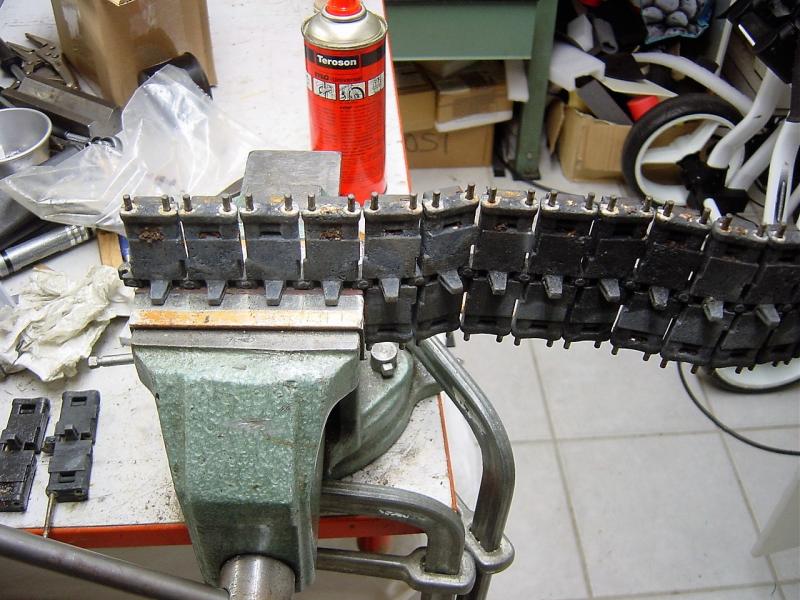 mir blieb nichts anderes übrig, als die ketten wieder zu zerlegen un einer gründlichen reinigung zu unterziehen, d.h. alle stahlstifte mit roher gewalt aus den kettengliedern zu entfernen (waren voll mit dem aluminium korodiert).