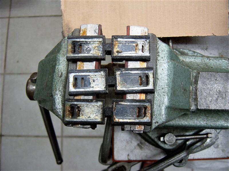 hier sind die kettenglieder voll durchgebohrt, aber durch das altern, mit was auch immer, waren die stifte mit dem alu sehr gut verklebt u. dementsprechend, schwer wieder zu trennen.