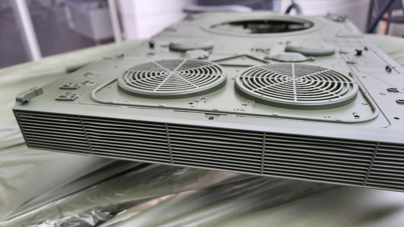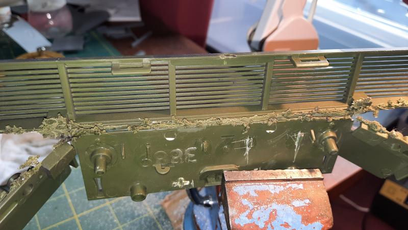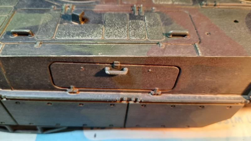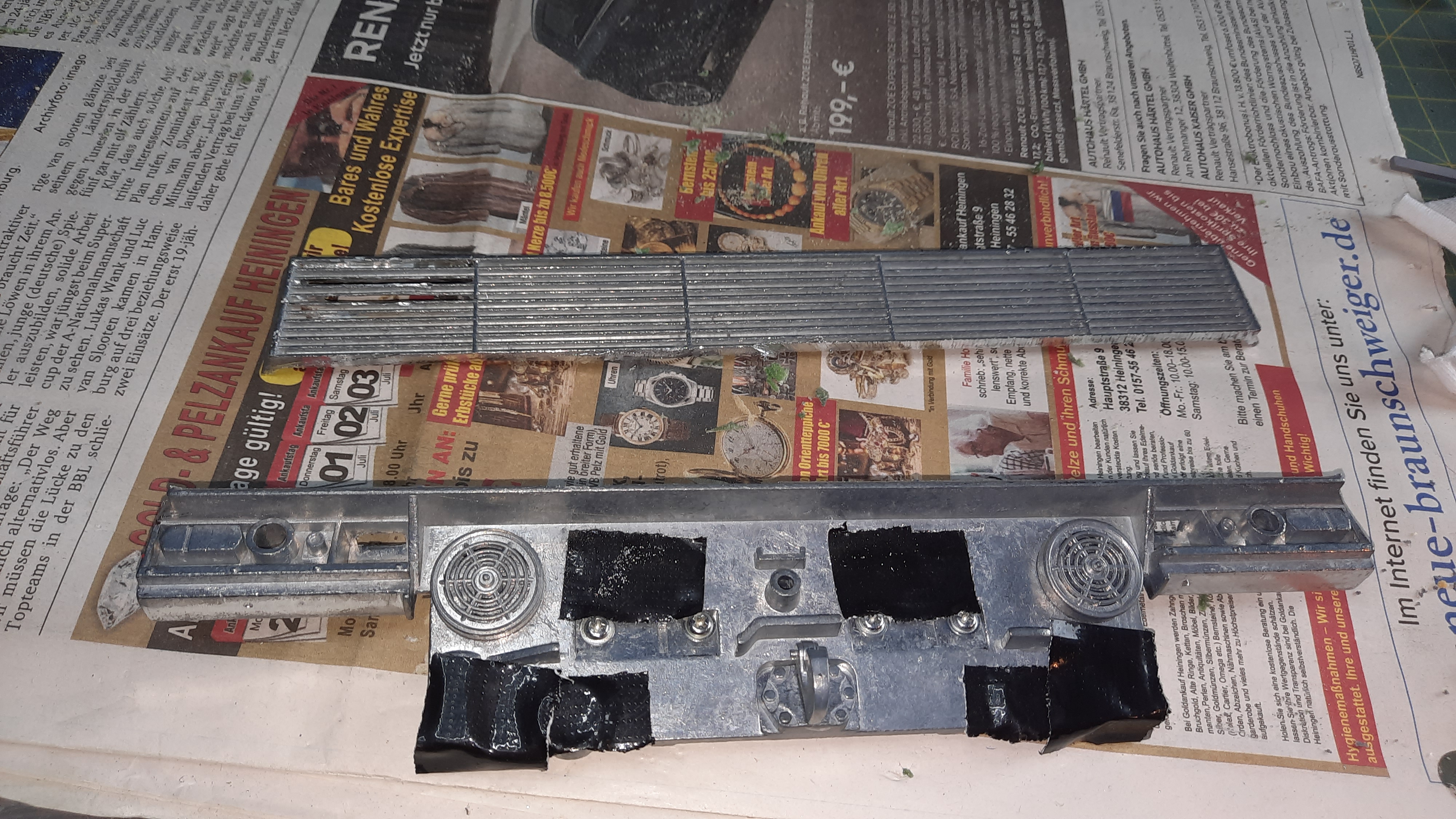 Der Kühlluftaustritt (Kühlergrill) am Heck, ist ein Teil mit der Heckplatte. Dieser ist leider auch nicht durchbrochen, Ich hatte zuerst versucht, mit dem Drehmel und Trennscheibe, die Schlitze rein zu "flexen". Da das Material aber an dieser Stelle sehr dick ist und die Schlitze einen Winkel nach unten aufweisen sollten, habe ich das nach 1,5 Schlitzen und ca. 5 Scheiben, aufgegeben. Ein Manko an dem Modell ist auch, das der Winkel zwischen "Kühlergrill" und Oberwanne seitlich eine Differenz von ca. 5° aufweist. Dadurch befindet sich dort ein unschöner, zulaufender Spalt. Das ist offensichtlich ein Fehler in dieser Bau Ausführung, das ist immer wieder auf Fotos und in Videos zu sehen. Meine Lösung für das Problem : "Kühlergrill" abgesägt, Heckelement Aus Kunststoff besorgt. Von diesem auch das Grill fein abgesägt, beides angepasst und Kunststoffgrill mit der Oberwanne verklebt. Die Trennstelle ist jetzt zwischen Grill und Heckplatte. Trennstelle ist "unsichtbar" und die angesaugte Luft kann nach hinten, vorbildgerecht, entweichen.