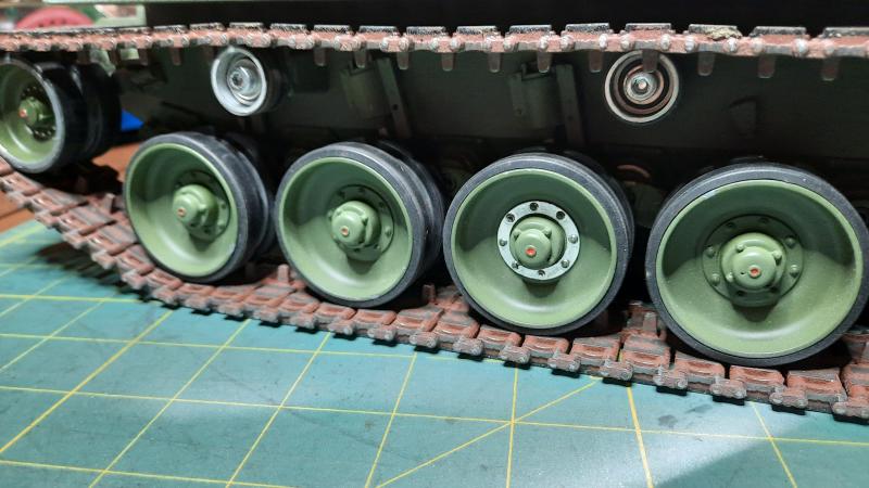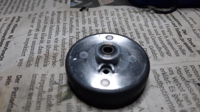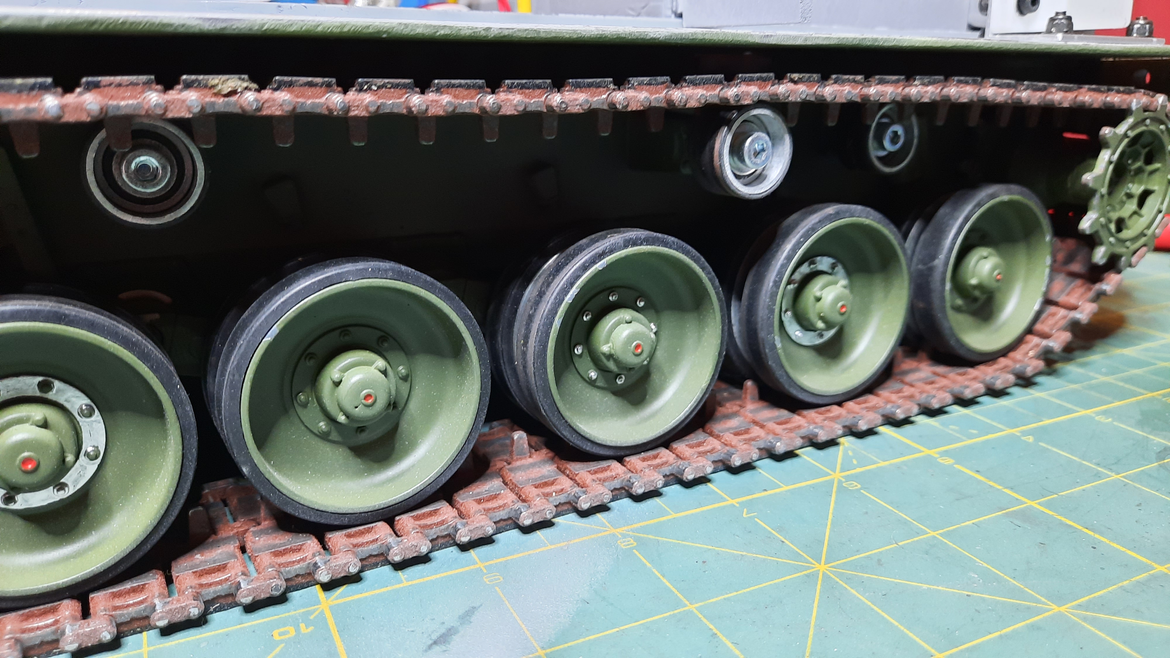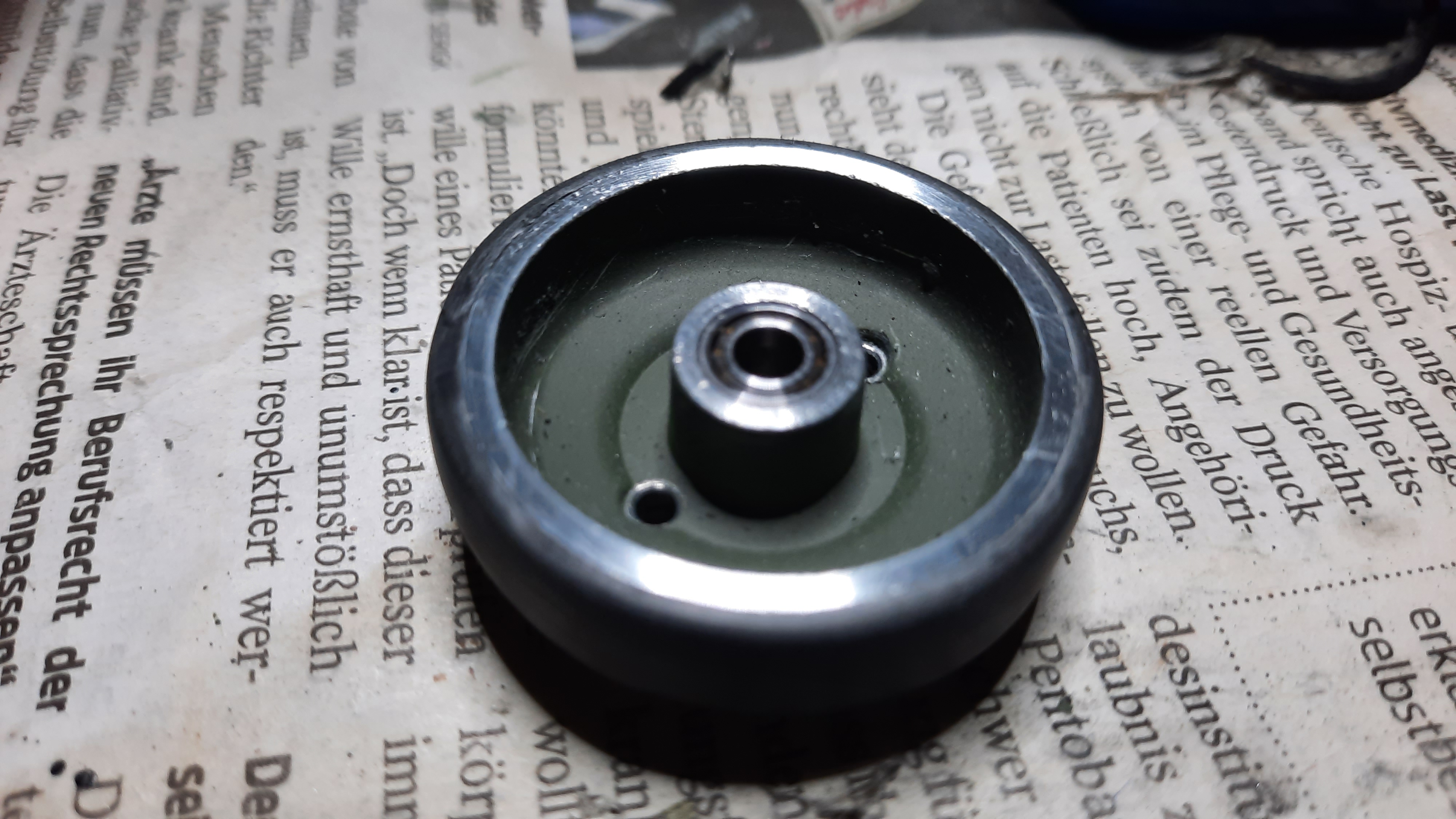 Ich weiß nicht warum, aber ich meinte; das ist ja schnell gemacht - Der Mensch denkt - der Modellbaugott lenkt. Ihr kennt das bestimmt... Irgendwann hat es geklappt, Finger verbrannt, halbes Leitrad / Spannrolle mit Heißkleber versaut. Das Geheimnis besteht darin den Schlauch extrem gleichmäßig zu erwärmen *Proxxon Fön* und die Rolle auf eine hitzebeständige Halterung zu stellen. Als die Konstruktion noch Warm war, habe ich das Ganze mit einem Schonhammer rund *geklopft*. Nach dem Abkühlen, mit einem Skalpell den Überstand abgetrennt, das Ergebnis macht die verbrannten Finger wieder wett. Kleiner Nebeneffekt - mit Metallkette hat es bei langsamer Fahrt, bis zum Stillstand immer ein SEHR originalgetreues -Klack - Klack - Klack .... gegeben - das ist jetzt leider weg