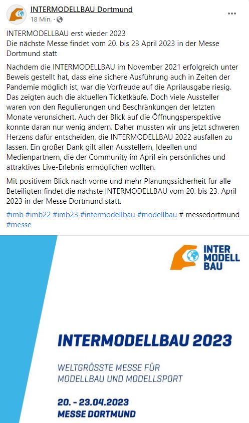 heute wurde die Intermodellbau Dortmund für 2022 abgesagt und ersatzlos gestrichen .