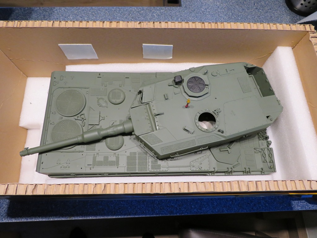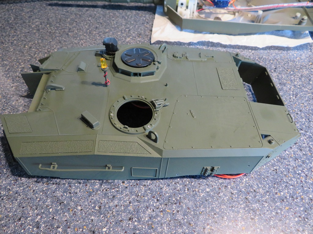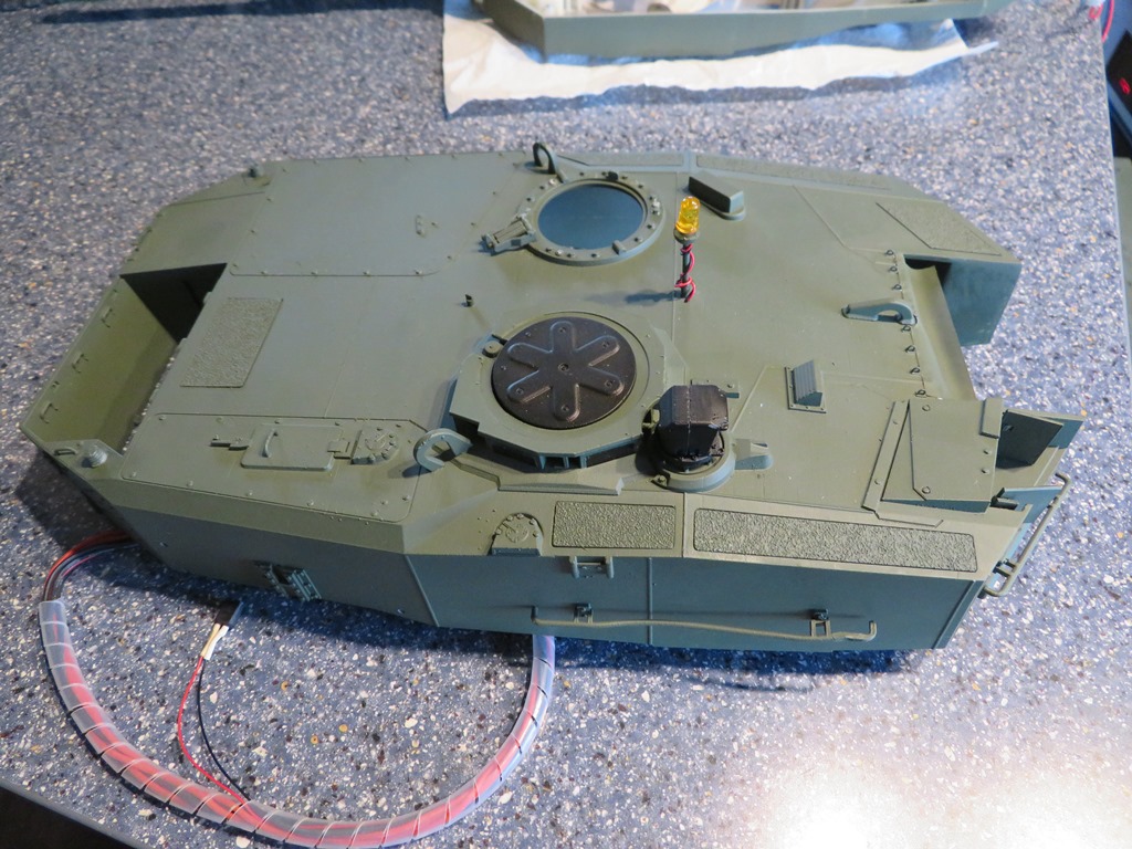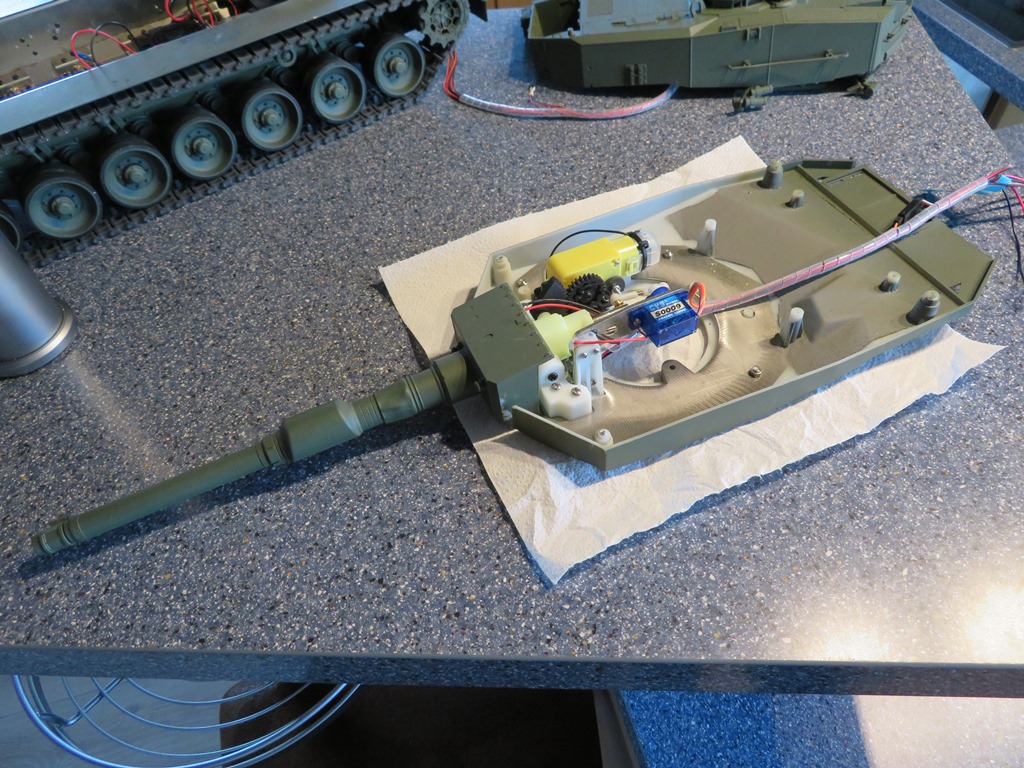 Habe meinen ersten oberwannenmäßig auf eine Tamiya Unterwanne verpflanzt - funktioniert wunderbar. Der Hooben hat viele Lichtfunktionen, welche ich in den Grundfunktionen an die Tamiya DMD angeschlossen habe. Für das Höhenrichten der BK wurde ein Servo eingebaut.