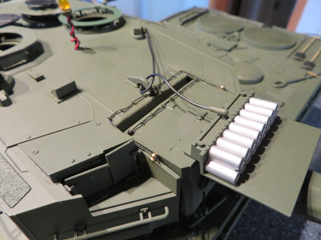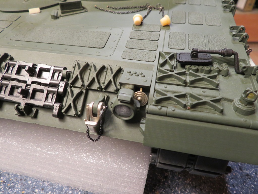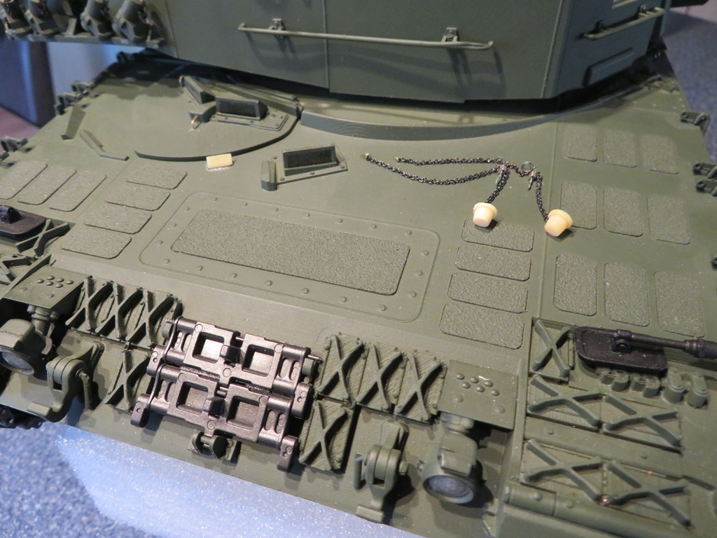 Dann folgte noch die Modifizierung vom Flaggenhalter, der beiden Antennenfüße und der Optik bzw. Blenden MG Gummi Stöpsel wurden an die erforderlichen Kettchen von der Kanonenblende gehängt.