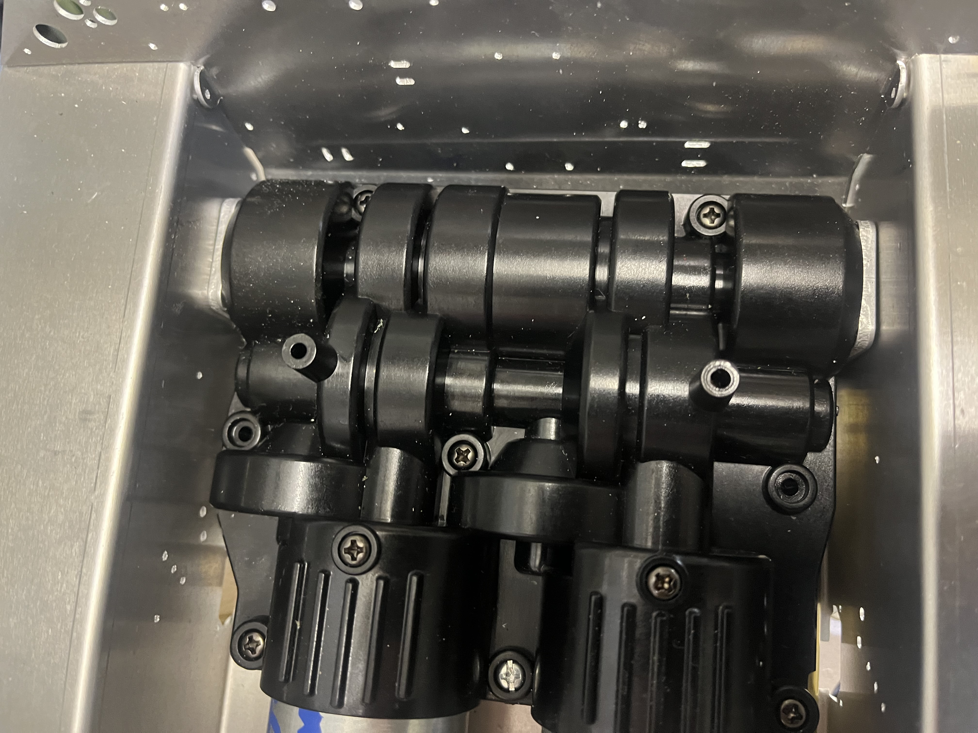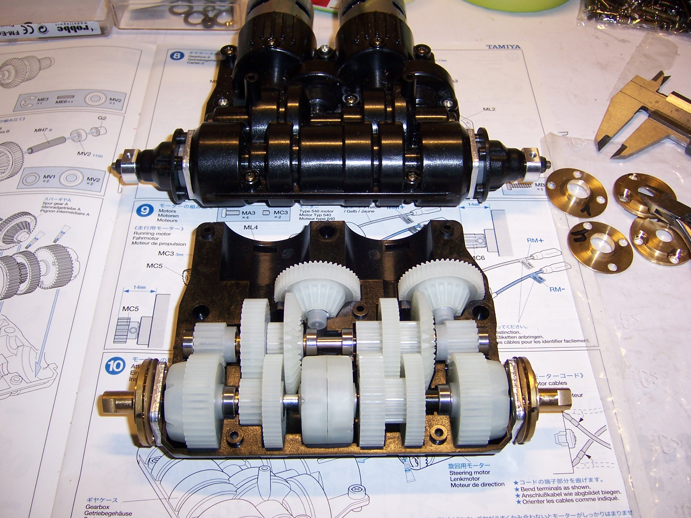 Oben liegt das original LEO 2 Getriebe , darunter das offenen ist mit unseren Adaptern für den LEO 1 vorbereitet.