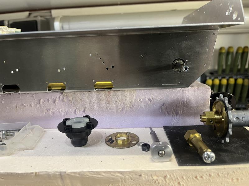 Hinten der Sechskannt kommt später weg wenn ich die richtige Länge ermittelt habe, ich werde mir zuerst von AFV die Antriebsräder bestellen und dann erst die anderen Teile anpassen , denke bei AFV ist innen in den Antriebsräder mehr Platz, wie in den alten Tamiya Teilen .