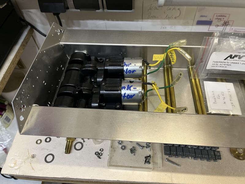 Getriebe habe ich heute Morgen angepasst , leichte Schrägstellung, hinten etwas höher und man meint AFV hat die Wanne für das Leo2 Getriebe gebaut , bei der alten Wanne orig Tamiya , mussten damals innen Abstandsringe gedreht werden .
