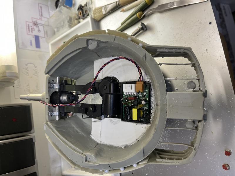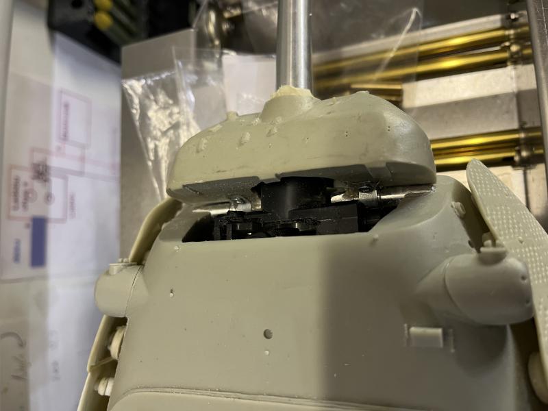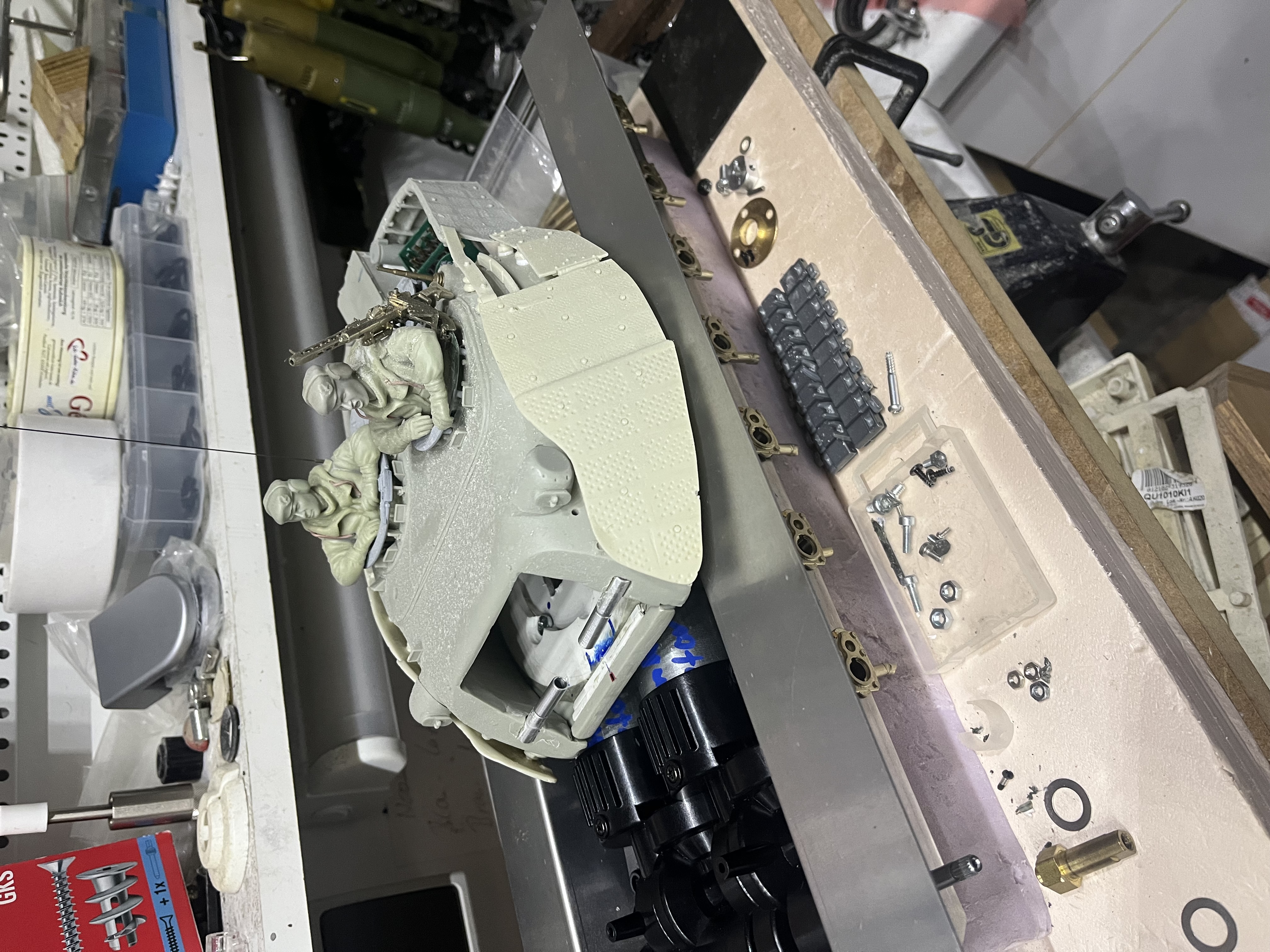 Hatte die Kanonenwiege vom Leo2 schon verbaut und mit Gewinde zum Verschrauben, aber es paßt nicht , der hintere Teil der Rohrrückzugseinheit haut auf den Turmdrehkranz, also Alles in die Tonne und dann kommt eben eine nicht so schöne Lösung , aber funktionell und kürzer , zum Tragen.